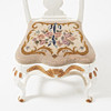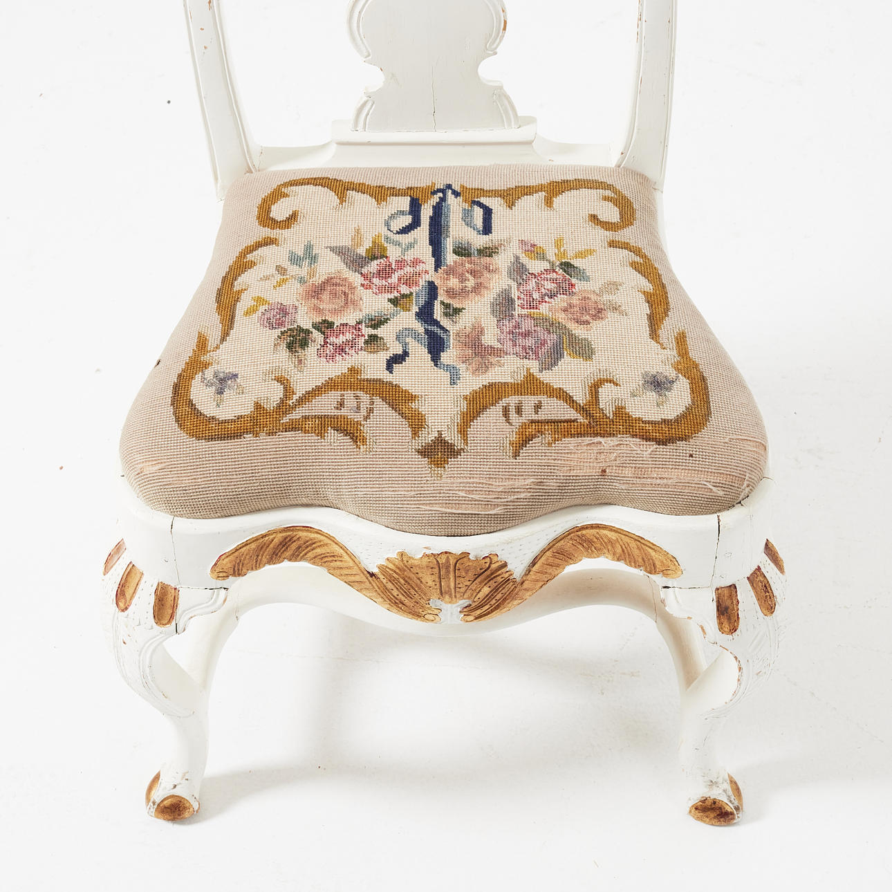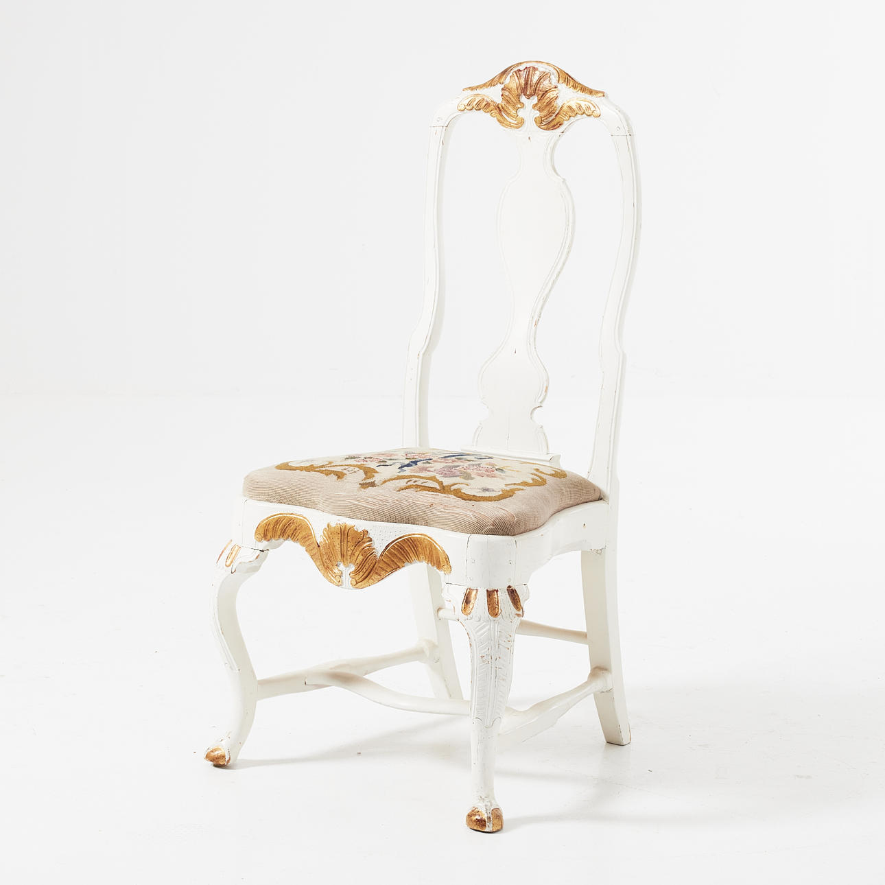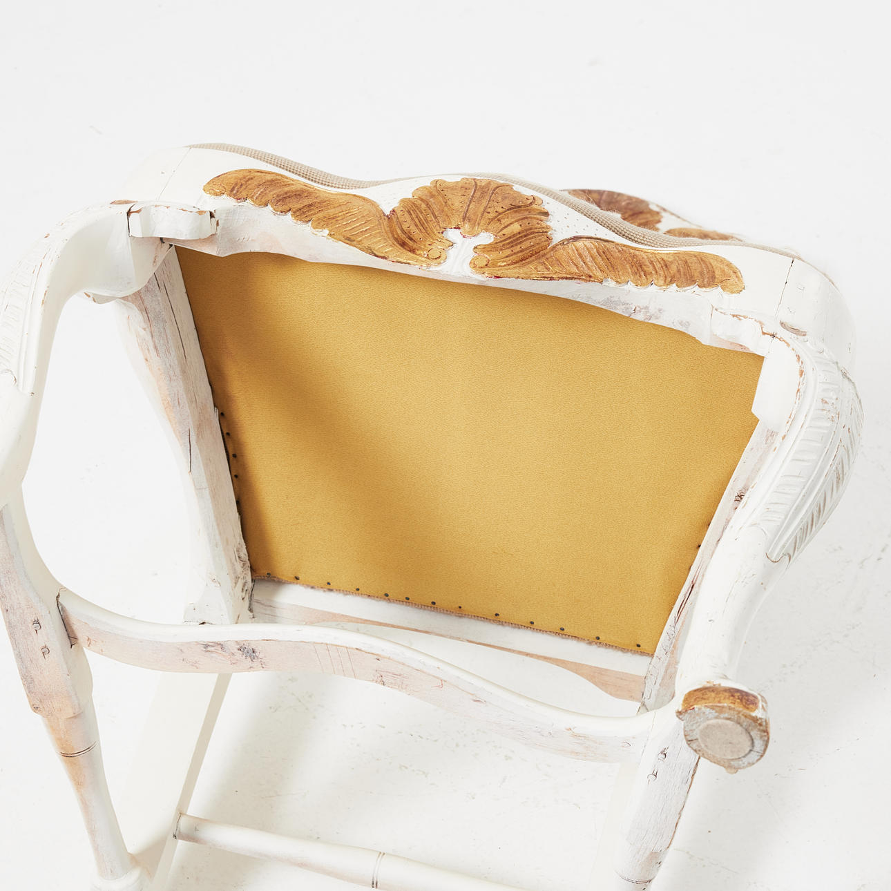decoración pintada y cortada, acabado cilíndrico en forma de bola y garra, asiento tapizado, altura del asiento aprox. 42 cm.