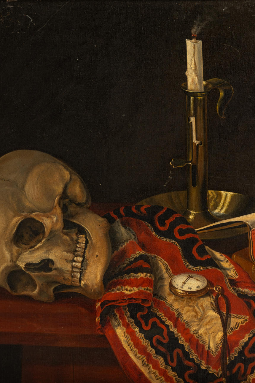 Adolf Lohse (1829-1907), bodegón Memento Mori, óleo sobre lienzo, colocado sobre madera, firmado, ca. 43 x 54,5 cm, con marco aproximadamente 58 x 68 cm.