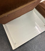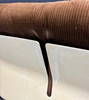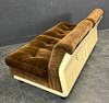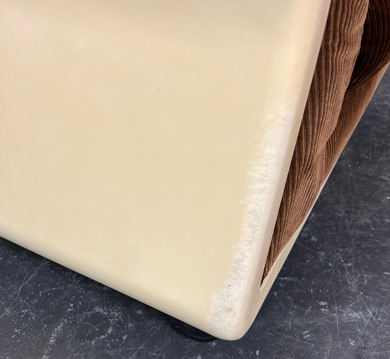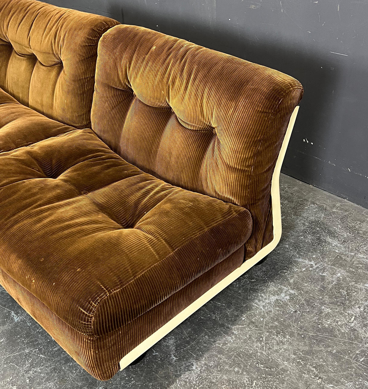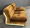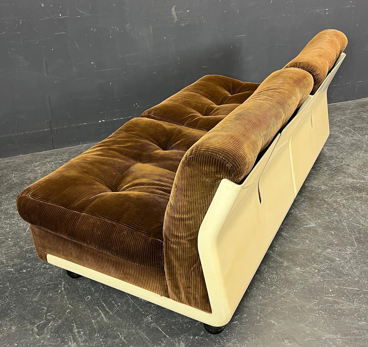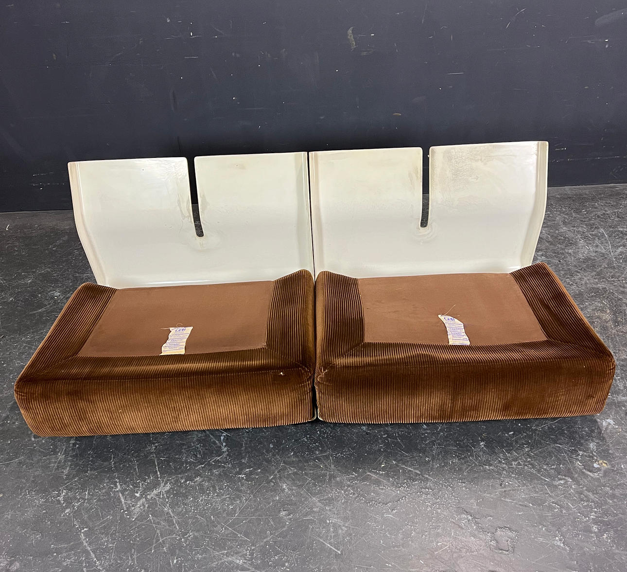 Carcasas de fibra de vidrio pintadas con tapicería suelta en pana marrón oscuro.