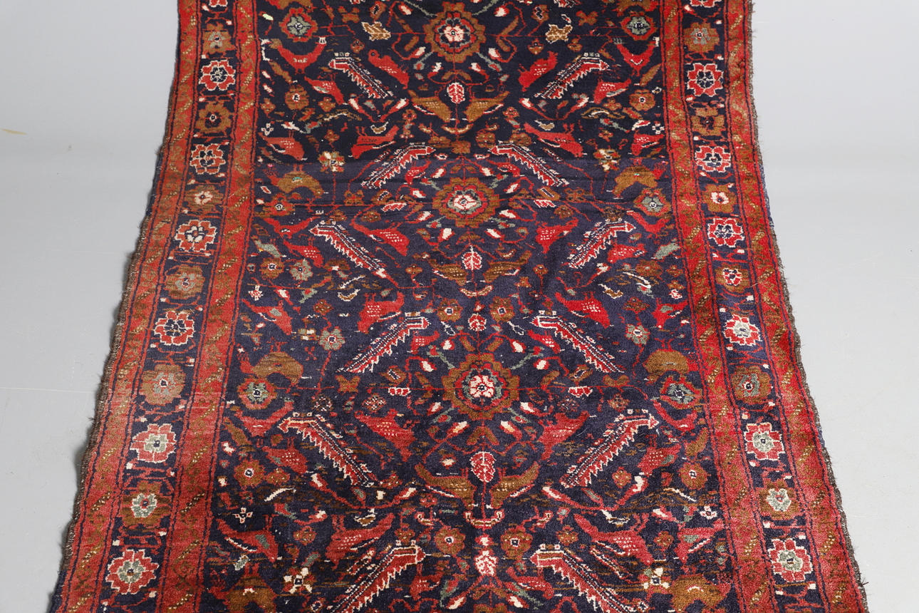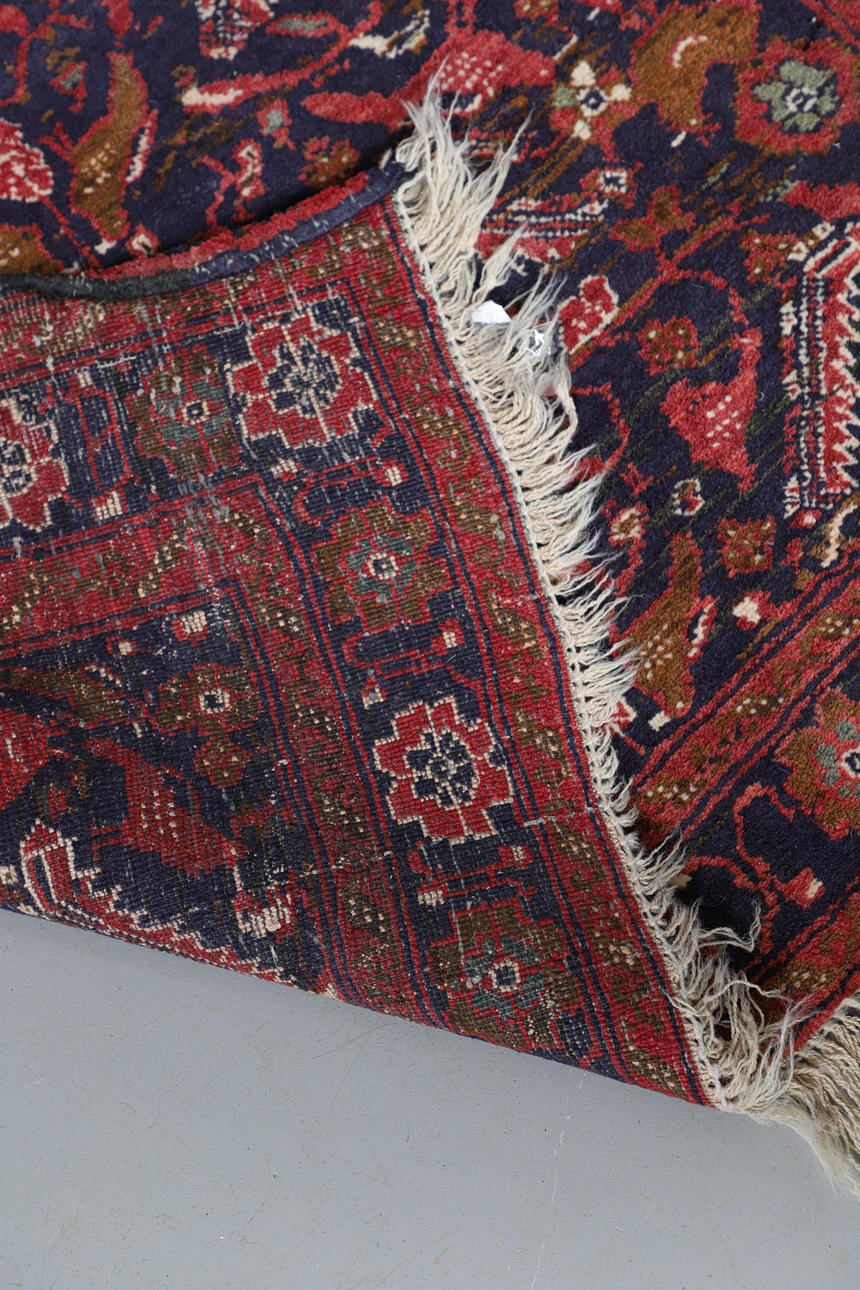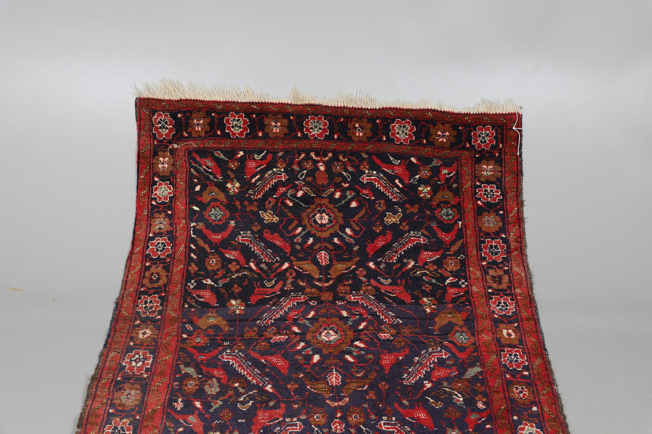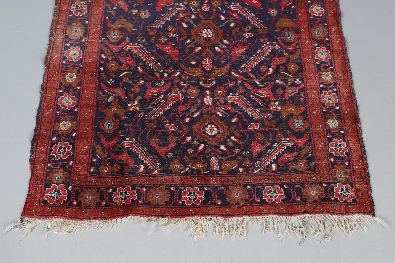 El campo índigo de hojas dentadas, pájaros y flores encerrado por bordes de rosetas, 167 x 100 cm.