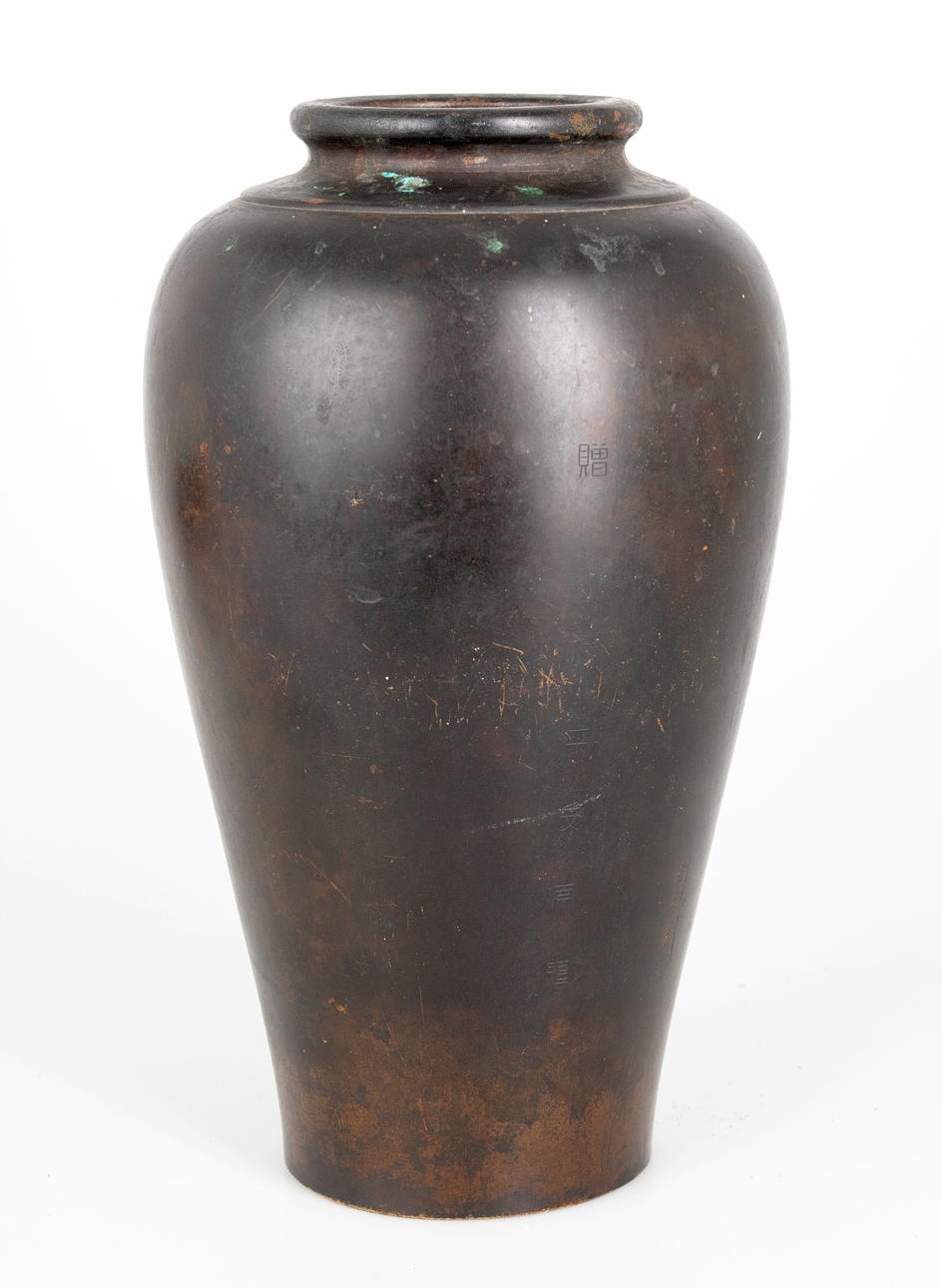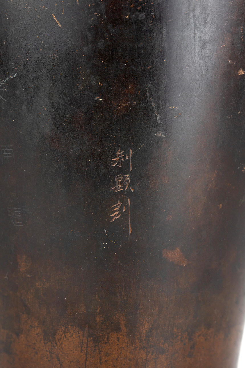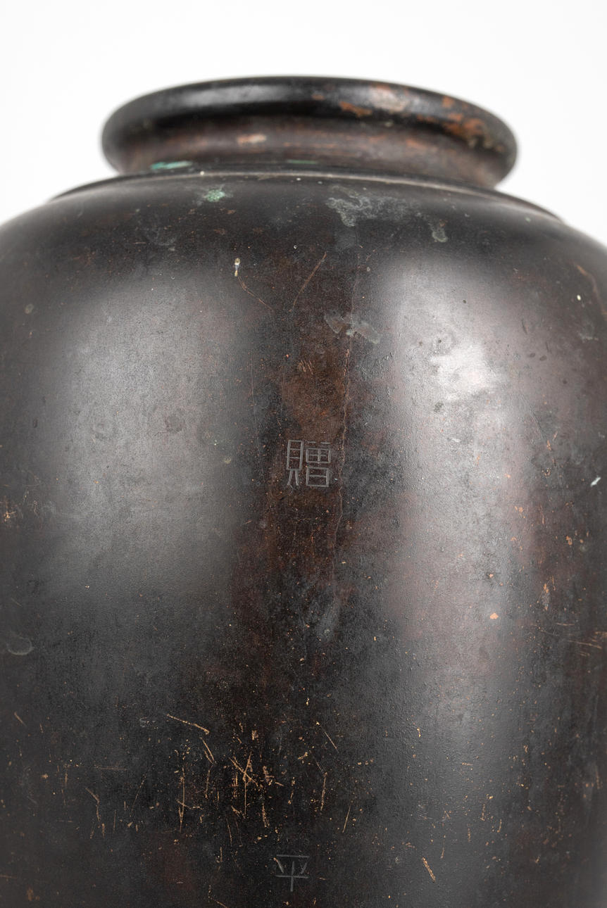 Bronce, patinado en tonos marrones. Decoración en relieve de grulla. Firmar.: (Japonés: ¿Toshiaki?). H. ca. 24 cm.