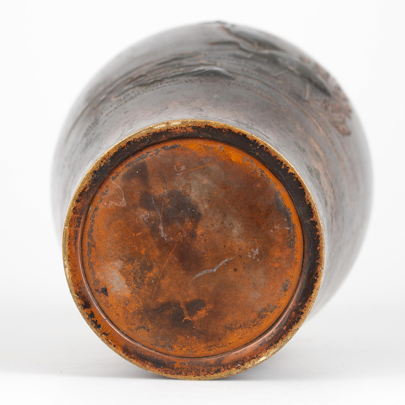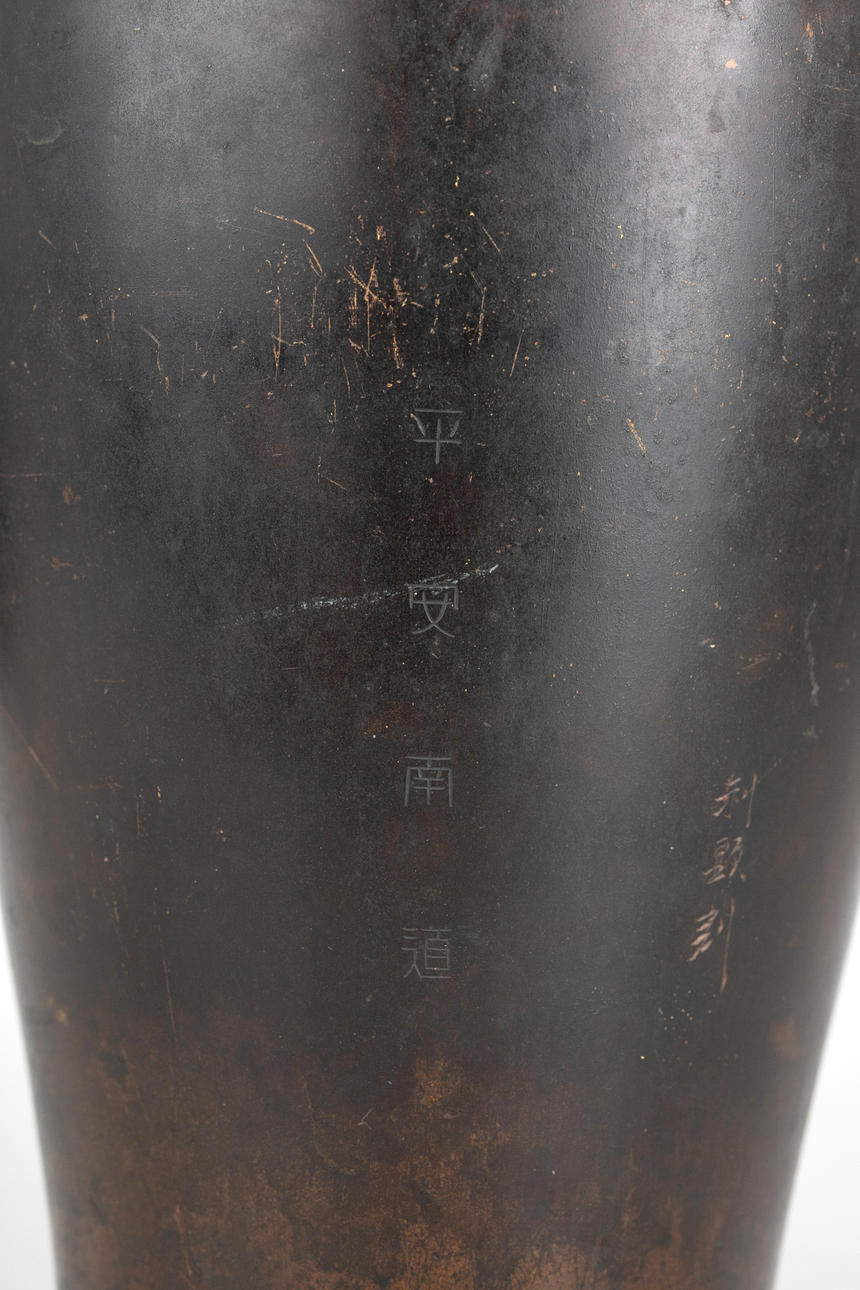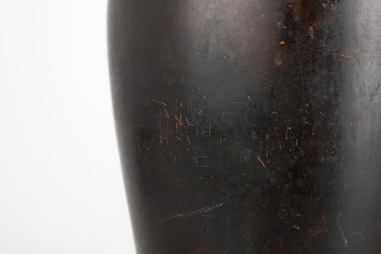 Bronce, patinado en tonos marrones. Decoración en relieve de grulla. Firmar.: (Japonés: ¿Toshiaki?). H. ca. 24 cm.