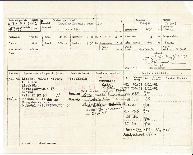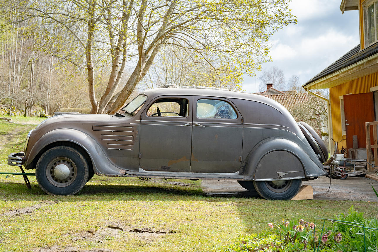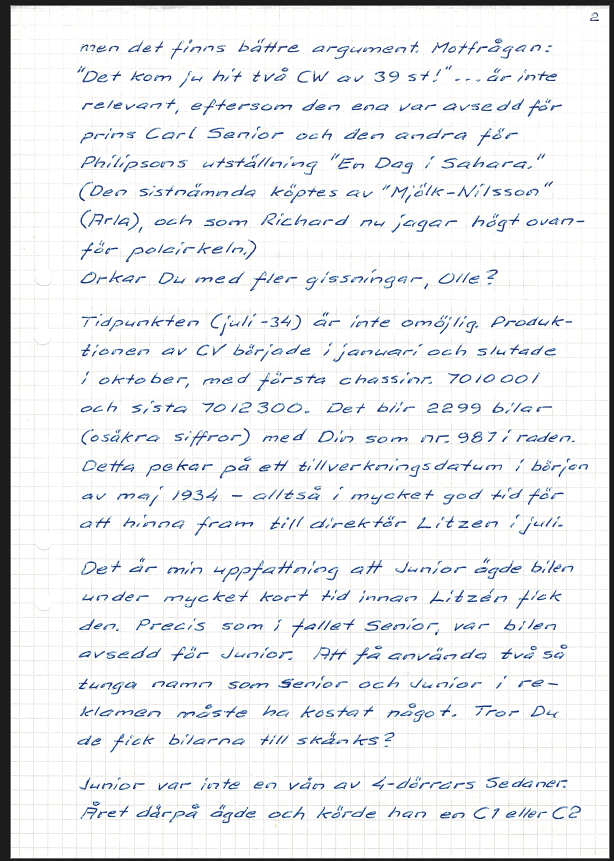 Según Edward Fogelmark, presidente del Airflow Club of America Sweden, el automóvil probablemente pertenecía al director Litzén en 1934. Vea la carta de Edward sobre la historia del automóvil a Olle Elfver en forma de imagen.