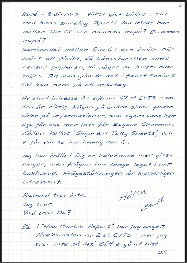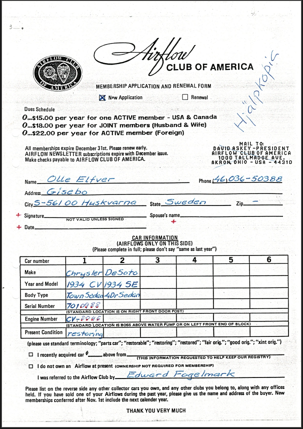Bienvenido al club, feliz continuación de 1993 y ¡disculpe mi membrete a cuadros! Tengo la intención de meterte en la cabeza: ¿tu currículum es idéntico al del Príncipe Carl Junior? Hay intensas discusiones entre Richard Walther y yo (¡mira la lista de miembros!) pero ambas son conjeturas. En esta situación, es natural que le dirija la pregunta a usted, aunque es posible que nunca haya encontrado la conexión. Richard es uno de los pocos que cuenta con la plena confianza de todo el Consejo de Administración del Condado (Länsstyrelsen sueco) a la hora de investigar archivos antiguos, a pesar de que está hecho para poder ver las puertas. Me ha proporcionado un montón de documentos de registro sobre Airflows, que espero procesar en algún momento, y cuando «encontró» tu currículum, le hice la pregunta a ev. conexión con Junior. ¡La respuesta fue no! Richard cree que el director Litzén fue propietario del automóvil demasiado pronto (julio de 1934). Este es su único argumento.