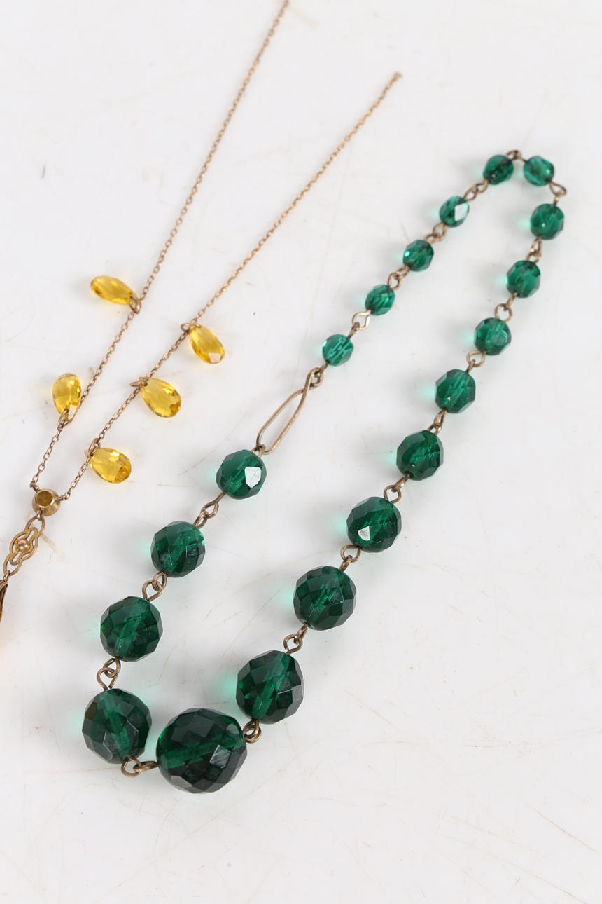 Al collar de pasta facetada verde le falta una sección final. Las piedras de pasta están en buenas condiciones.