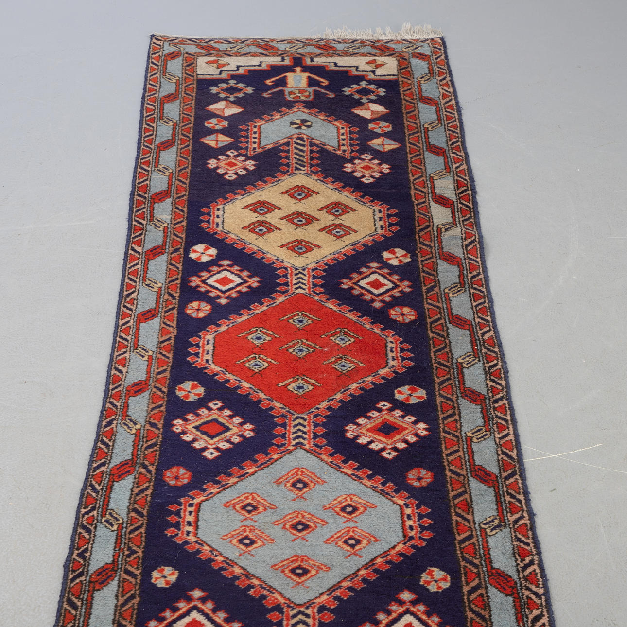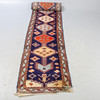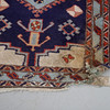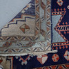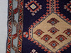 lana sobre lana. Cuerdas de medallones geométricos en azul, rojo y beige sobre un fondo azul oscuro.