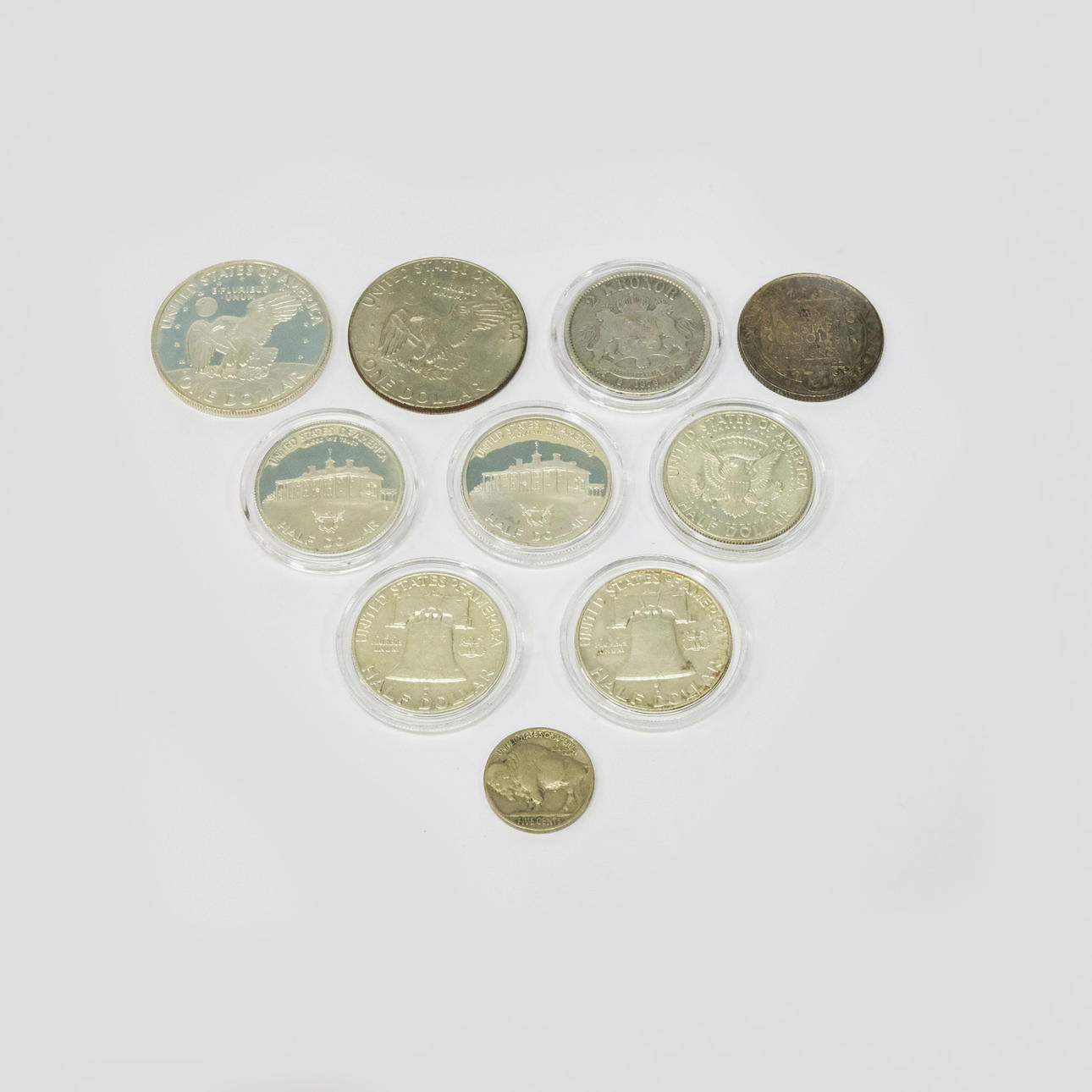 Dos monedas de medio dólar Franklin de plata, 1963, diámetros. 3 cm, peso total de unos 25 g.