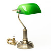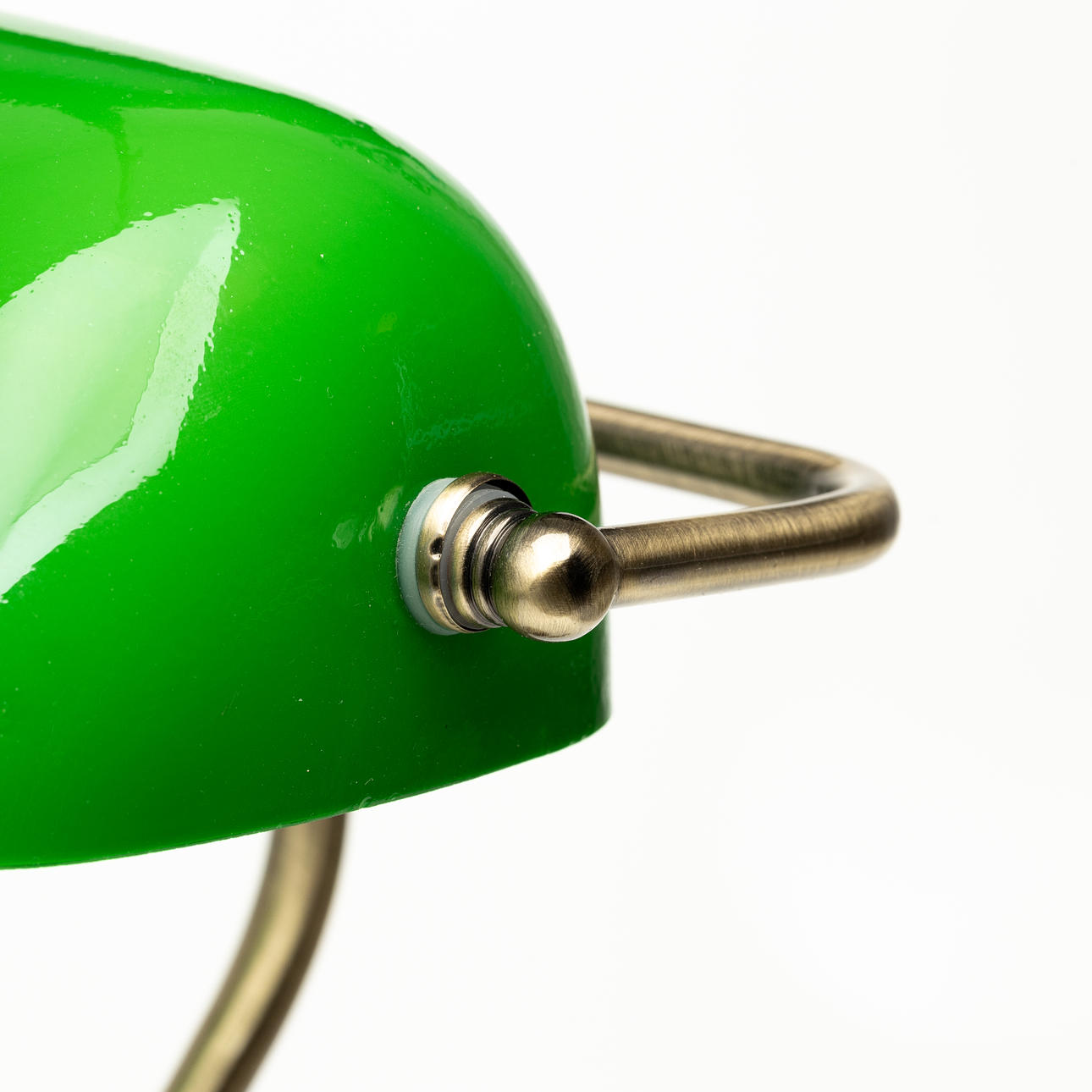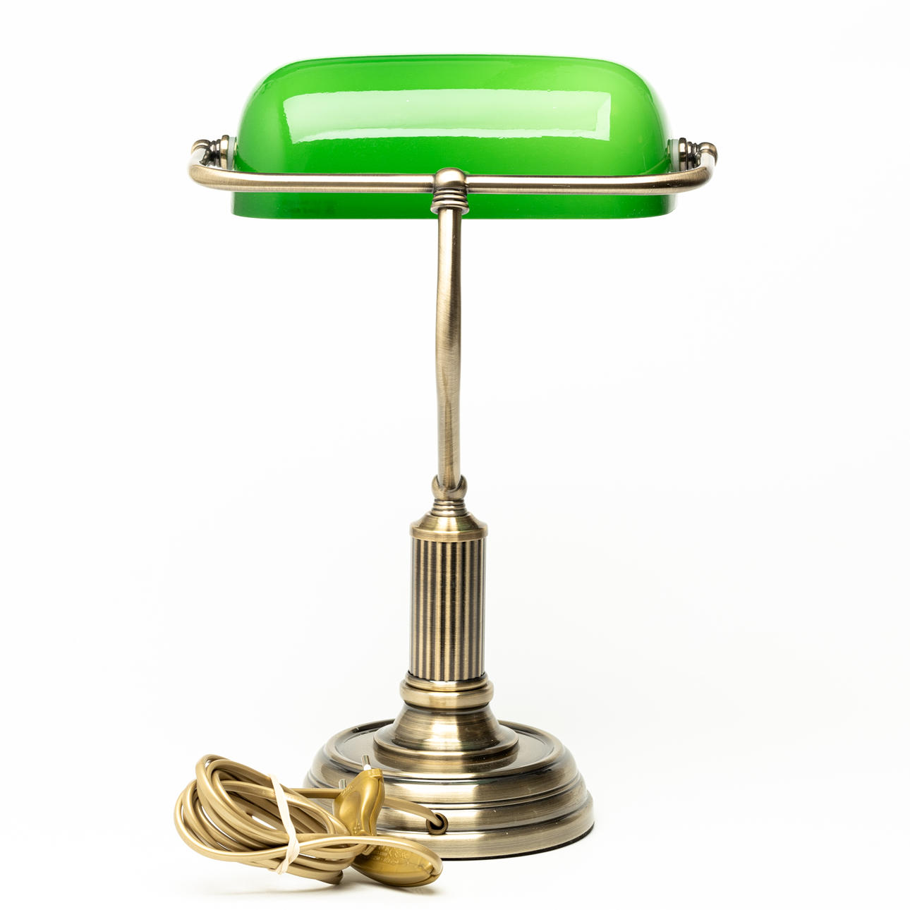 Metal amarillo, pantalla de cristal verde. Altura aprox. 38,5 cm.