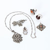Entre otras cosas, anillo de plata con ágata Engs Guld Och Silver Steneby 1965, colgante de plata con pasta (vidrio) y broche de plata con marcasitas.
