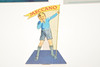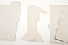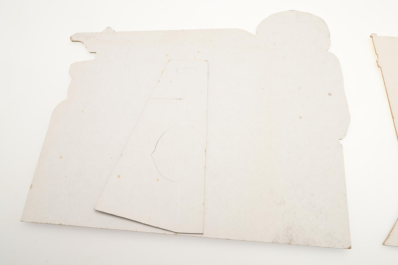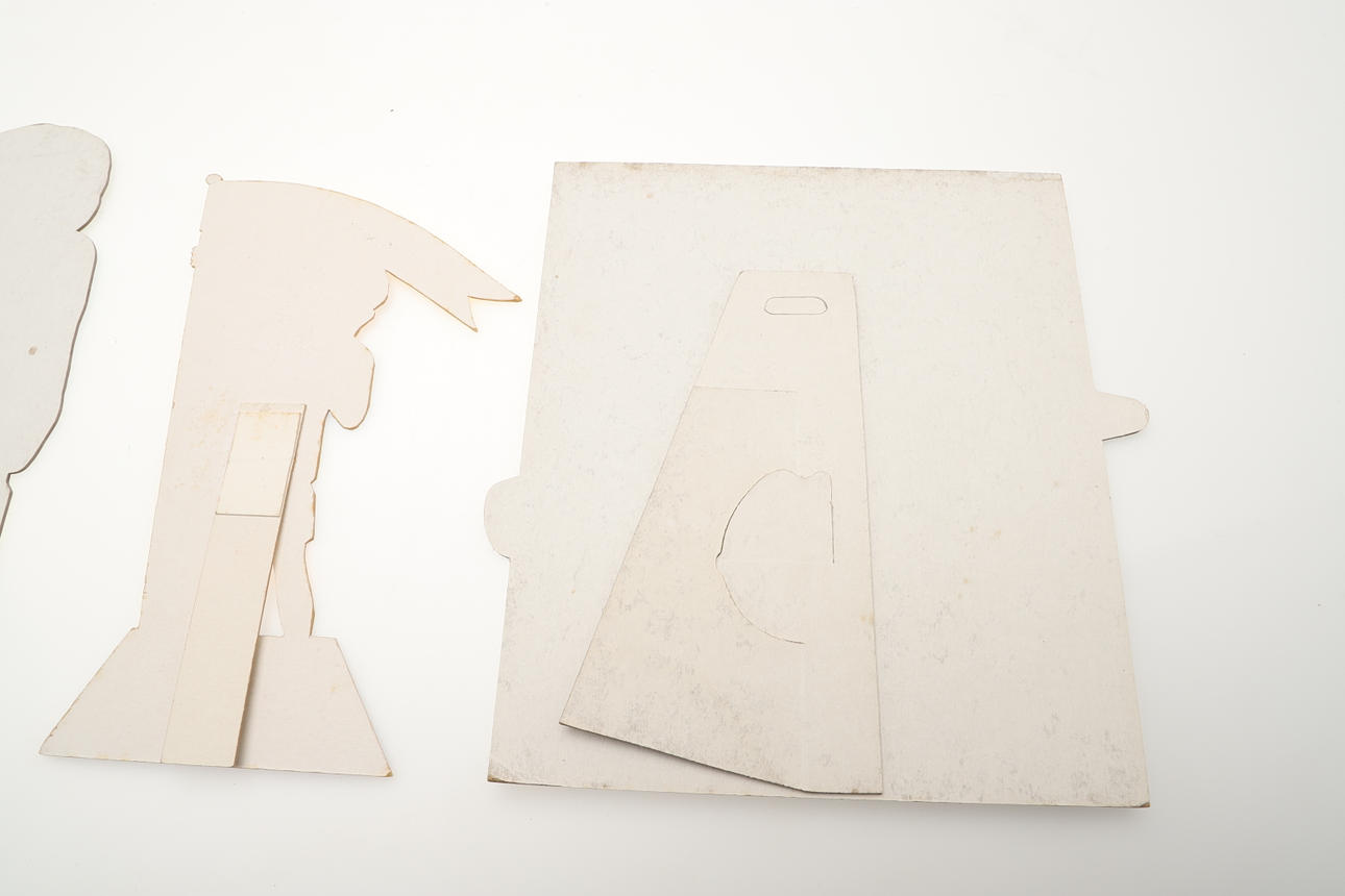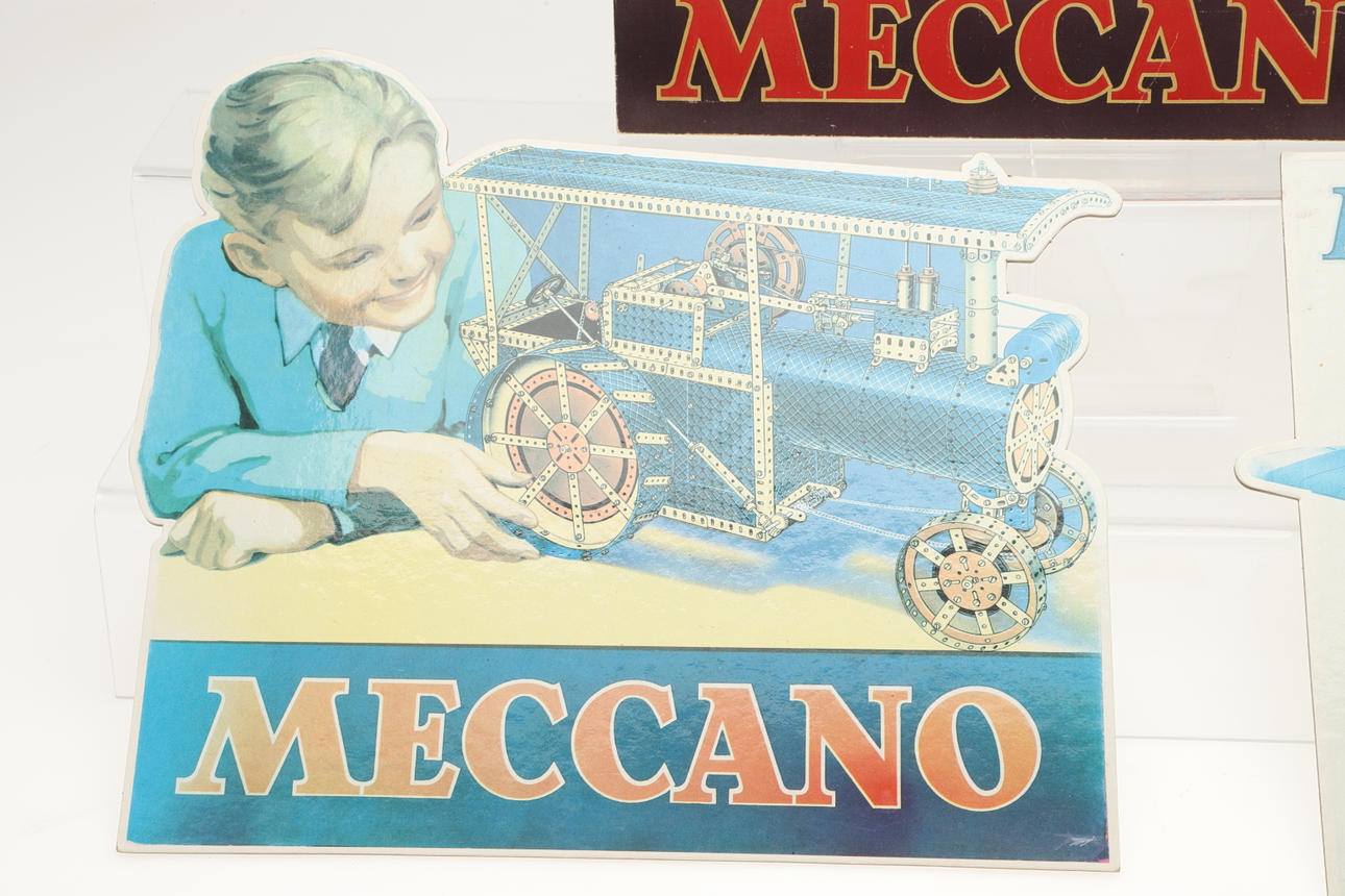 Cuatro carteles publicitarios diferentes de tarjetas Meccano, cada uno con puntales para sostenerlos en una superficie. La más grande mide 31,5 cm de ancho. (4).