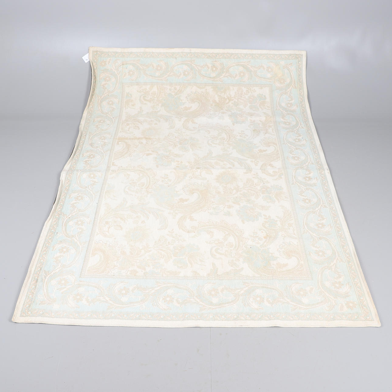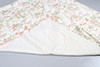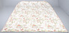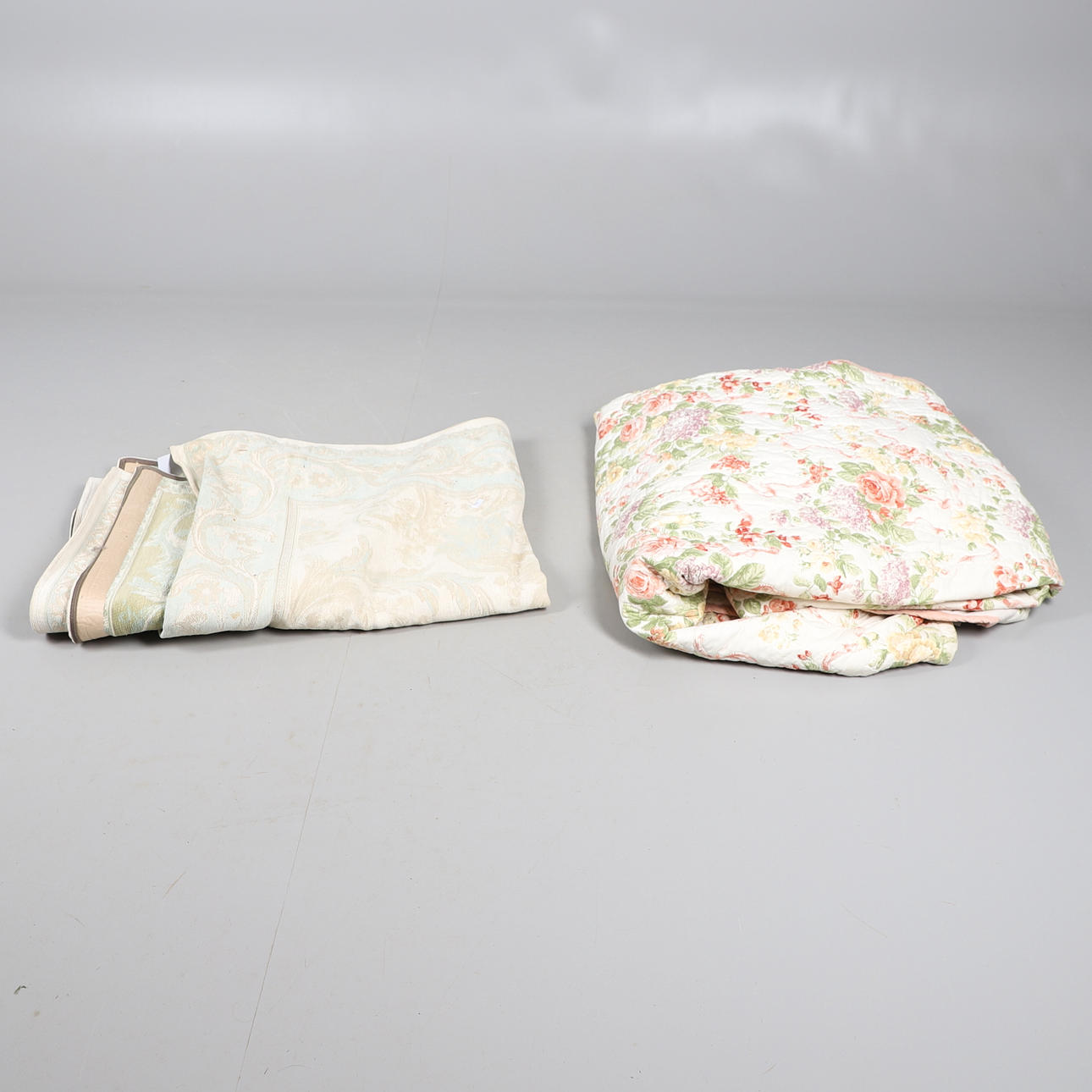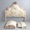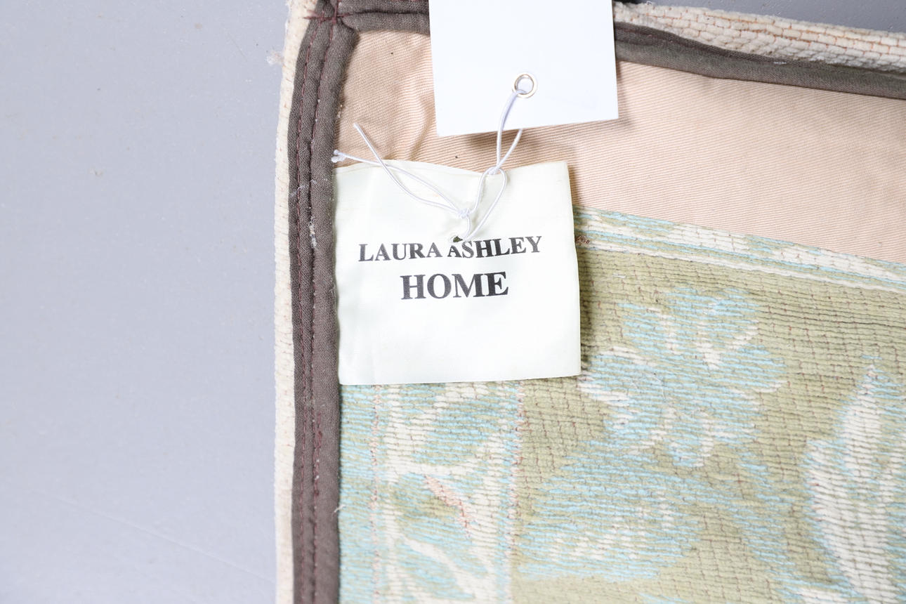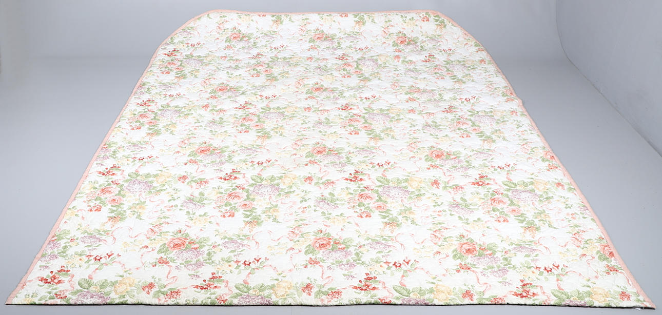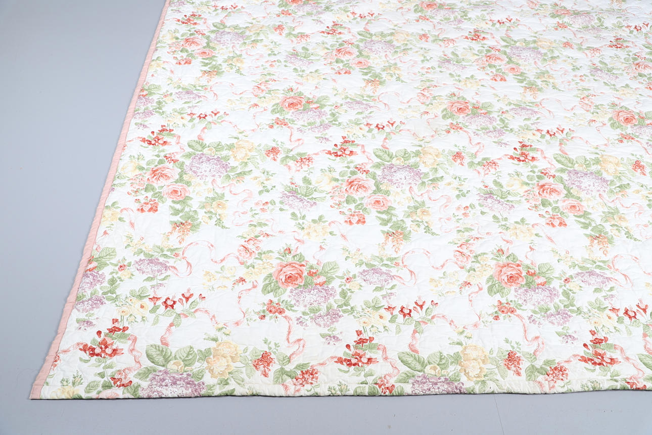 con estampado floral y tablero de madera dorada tallada, 164 cm de ancho x 153 cm de alto, junto con una colcha acolchada tamaño king a juego y una alfombra «Home» de Laura Ashley, 237 cm x 163 cm.