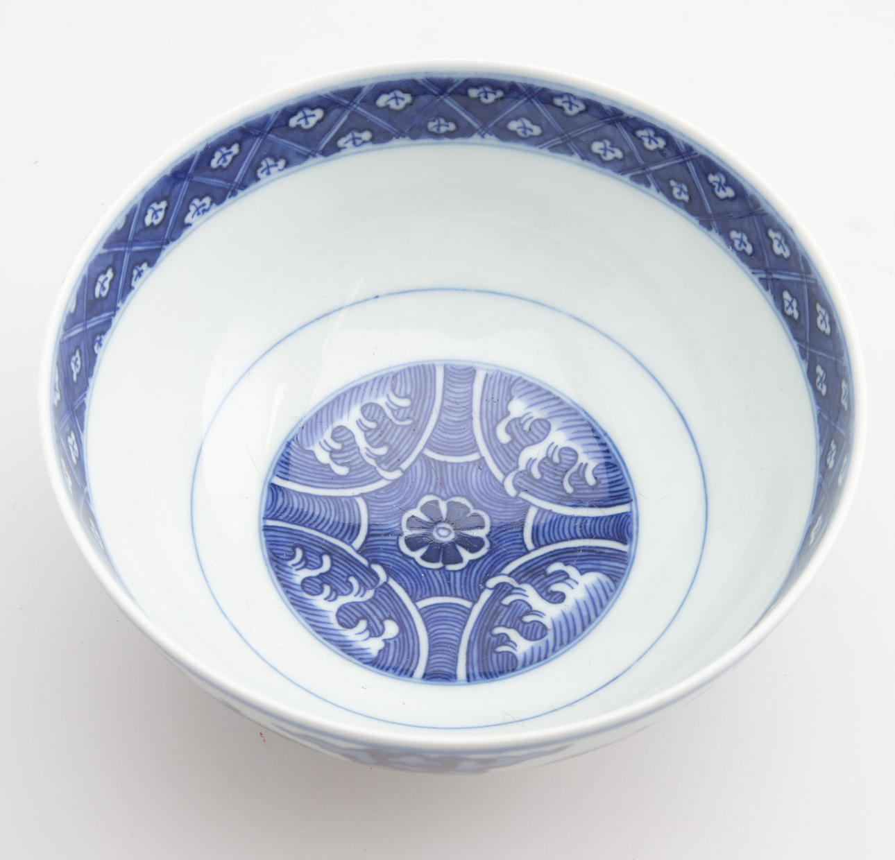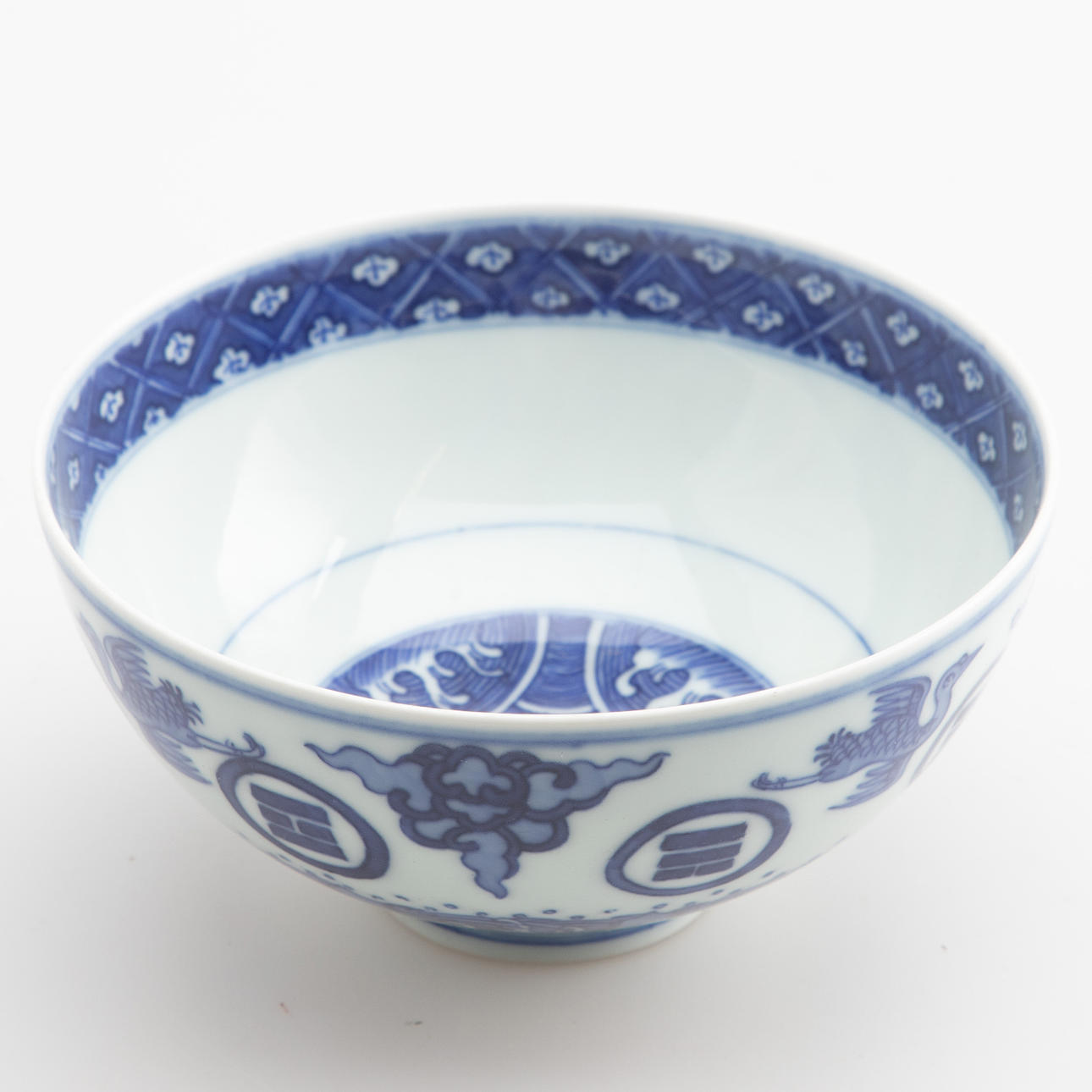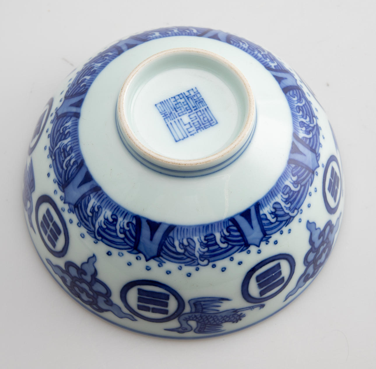 Gres, pintura sobre vidriado azul. Patrón ondulado en reserva redonda en el espejo. Pared exterior que rodea «ocho trigramas» entre grullas y nubes sobre olas y rocas. Marca de seis caracteres: Da Qing Qian Long Nian Zhi HxDM cca 7 x 14 cm.