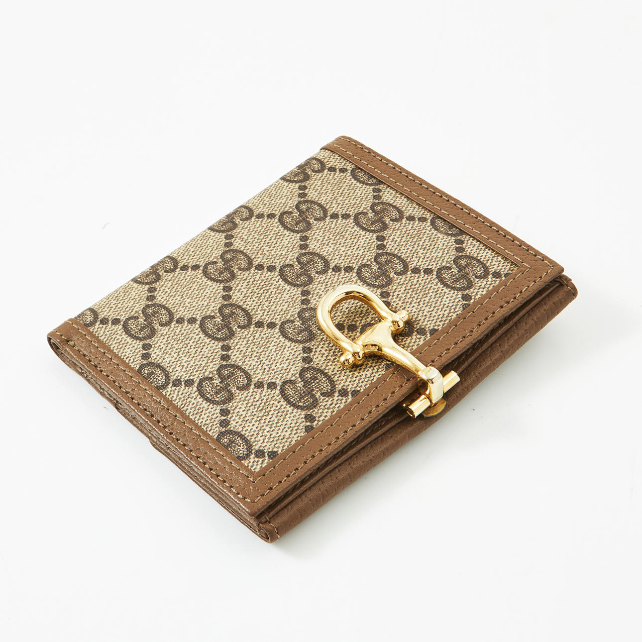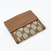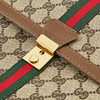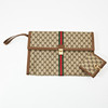 En lona con estampado de monogramas, colgantes clásicos de Guccian en verde y rojo, hebilla de metal amarillo, con correa, forrada de gamuza, varios compartimentos y áreas de almacenamiento, dimensiones aproximadas de 28 x 40 x 4 cm, cartera a juego con hebilla en forma de betsel de metal amarillo, con monedero con botón, dos compartimentos para billetes y cuatro compartimentos para tarjetas, dimensiones aproximadas de 12 x 12 x 10 cm.