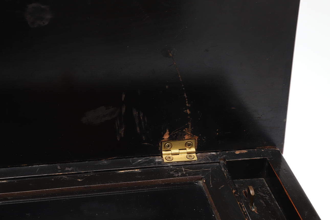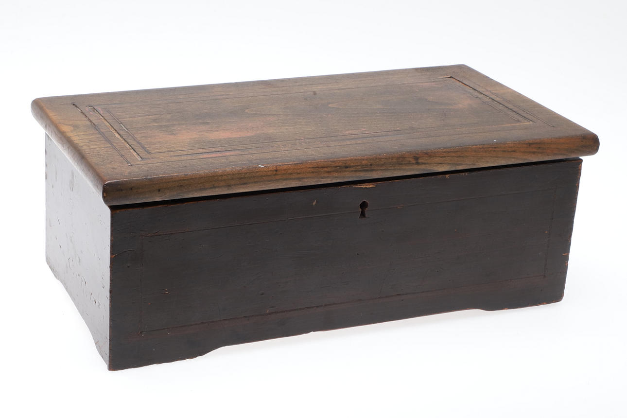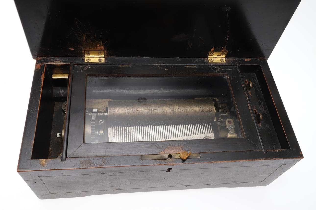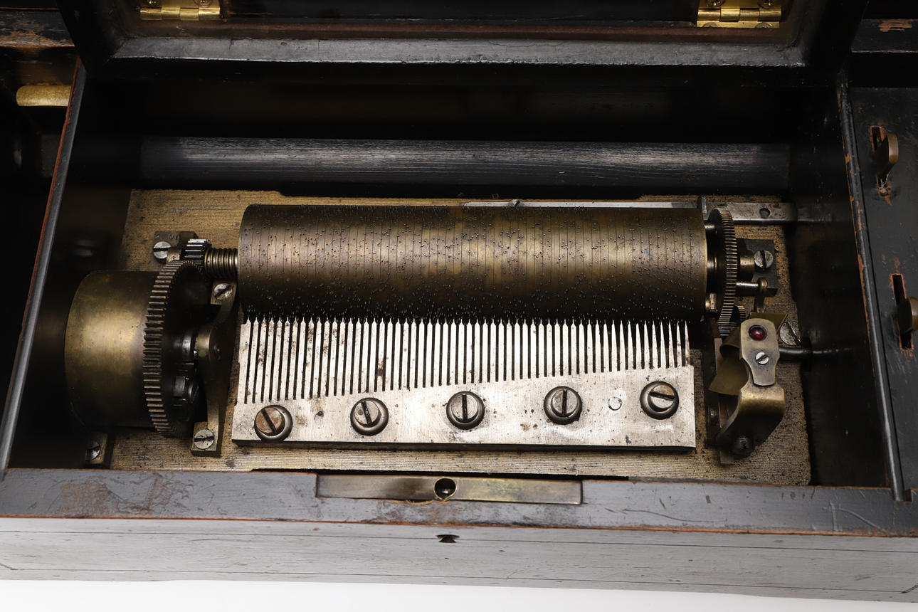 Una caja de música victoriana con palancas de cambio/repetición y inicio/parada, posiblemente un movimiento aéreo de 6 u 8, pero falta la partitura. Con un número de serie estampado en el interior y un número marcado en la base. En funcionamiento, funda de 34 cm de ancho, cilindro de 15 cm de largo.