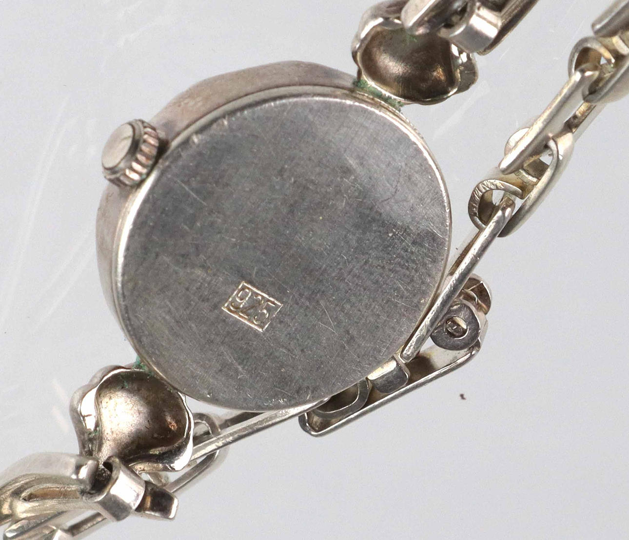 Reloj de pulsera de plata 925, estampado tanto en el cierre como en el fondo de la caja. funda de reloj redonda ref. «Geneve», pulsera de plata con cierre, movimiento de cuarzo, peso 12,7 gramos. Ø 178 mm.