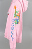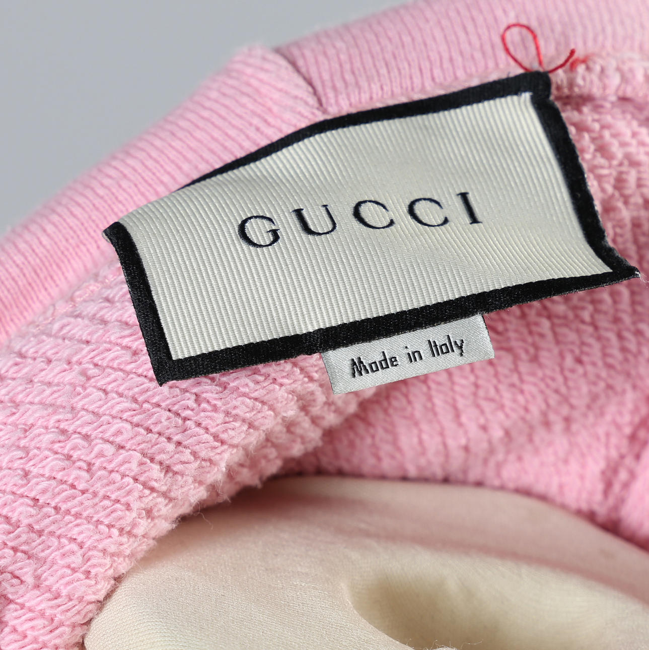 En rosa con un dragón bordado en el hombro izquierdo y un gran logotipo de Gucci en la parte delantera, sin etiqueta de talla, pero parece ser una talla grande del Reino Unido.