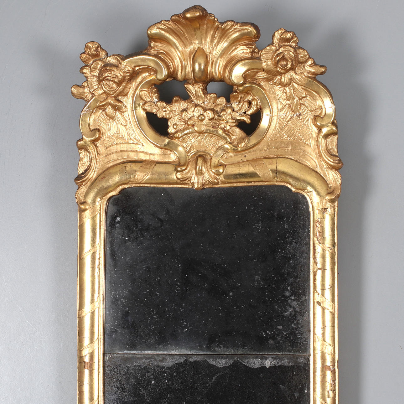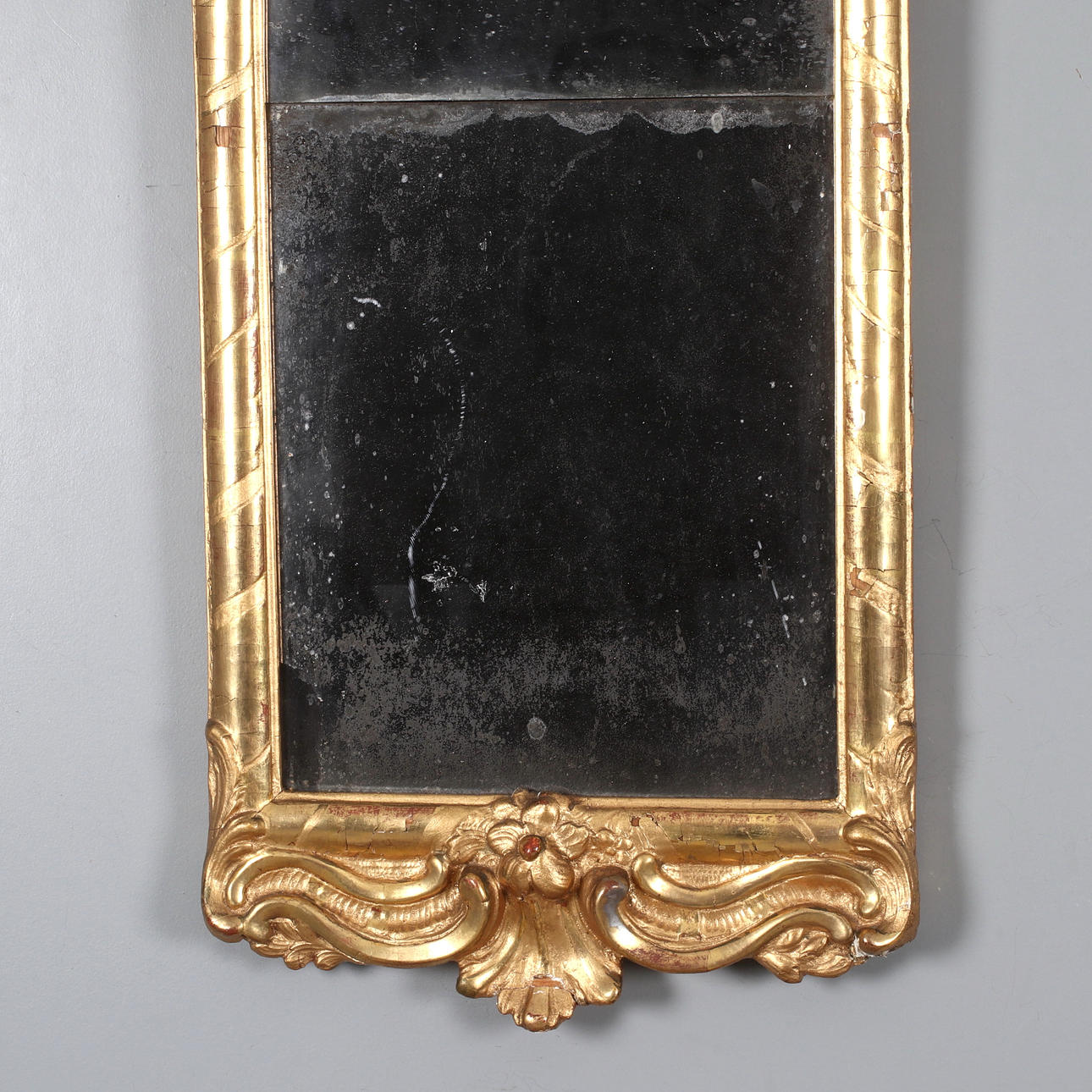 Estructura dorada y bronceada, corona calada, cristal de mercurio antiguo. Altura 84, anchura 33,5 cm.
