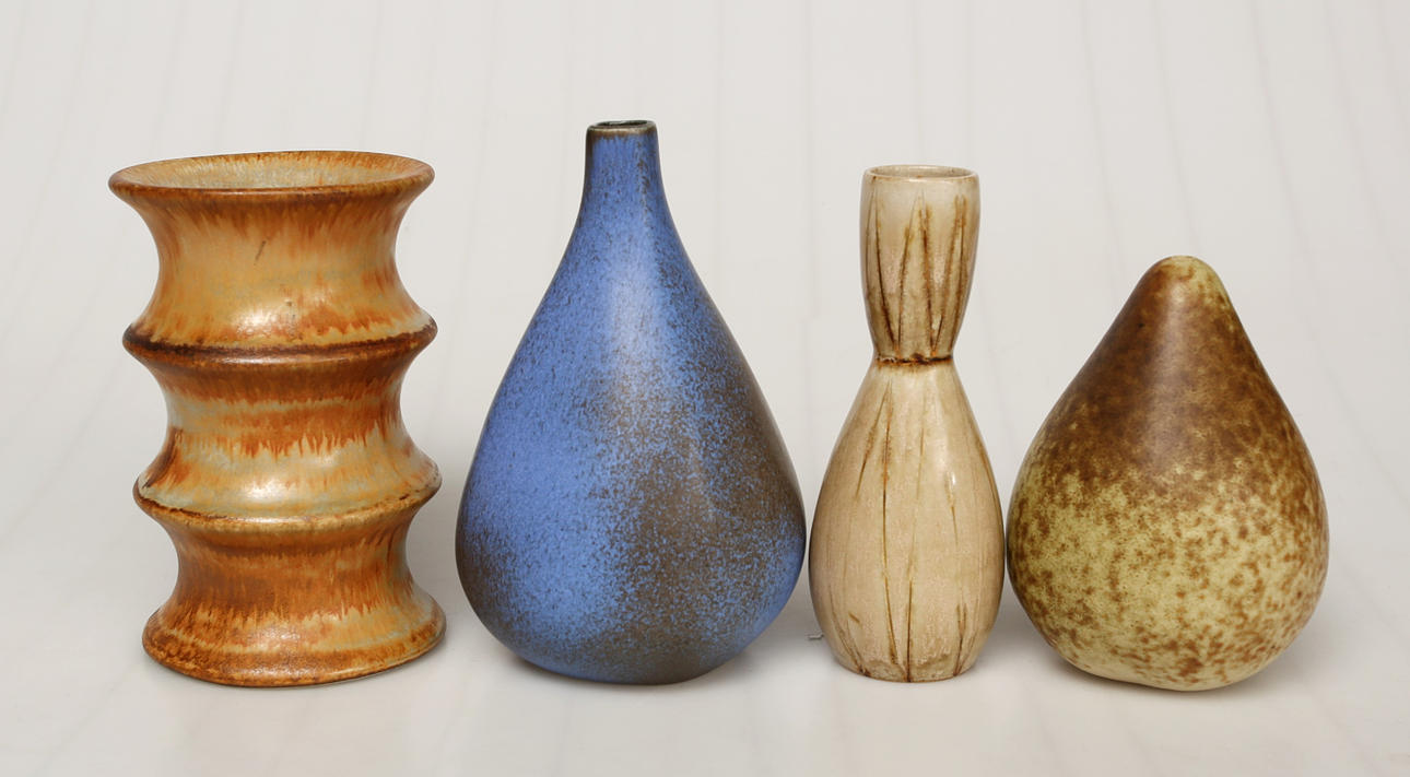 Jarrón azul 17 cm Jarrón beige AJ Höganäs, 16 cm Escultura Fogelberg 14 cm Jarrón marrón Bruno Karlsson, 15 cm.