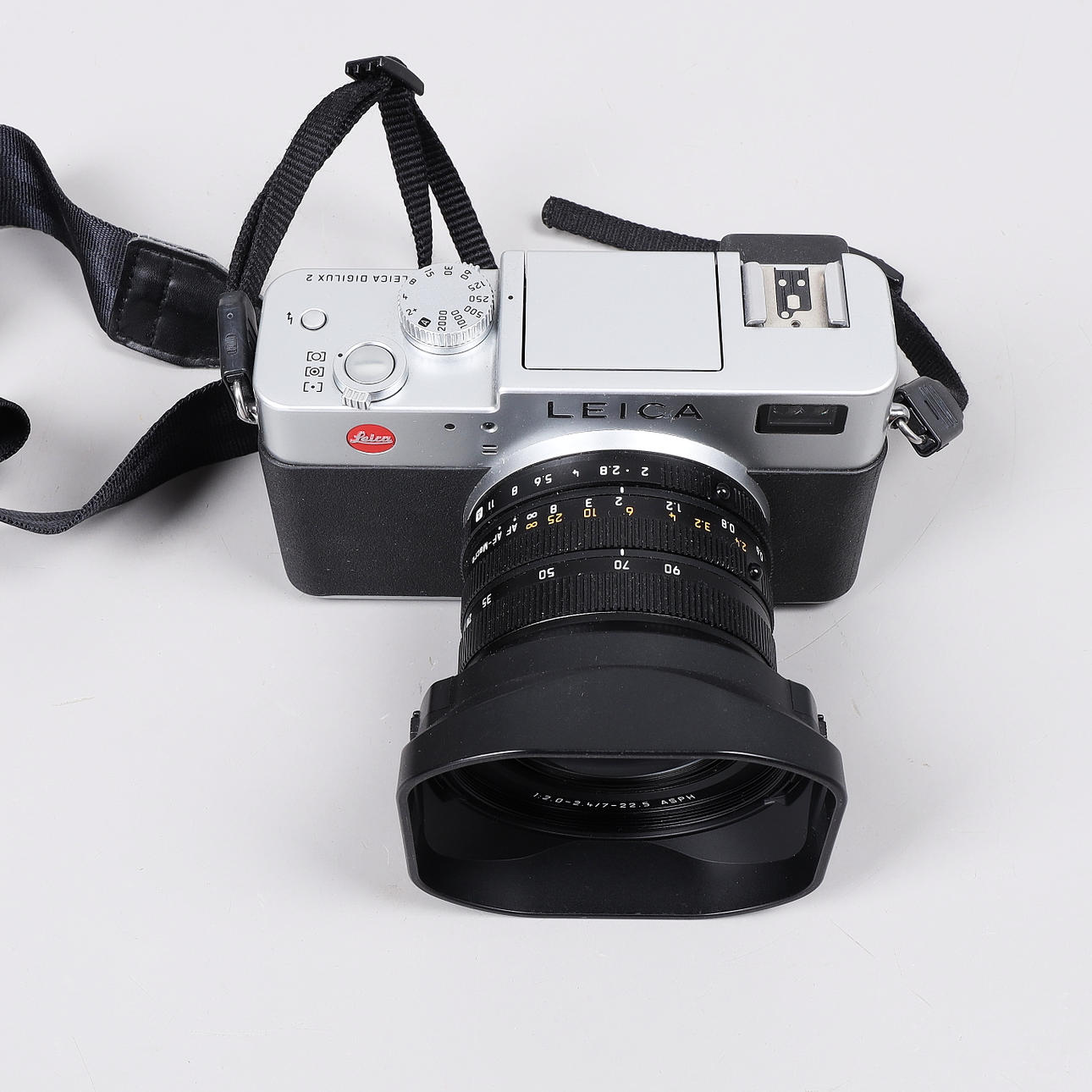 Cuerpo de cámara, Leica Digilux 2. Lente, Leica 7-22.5/2.0-2.4. Funda para cámara.