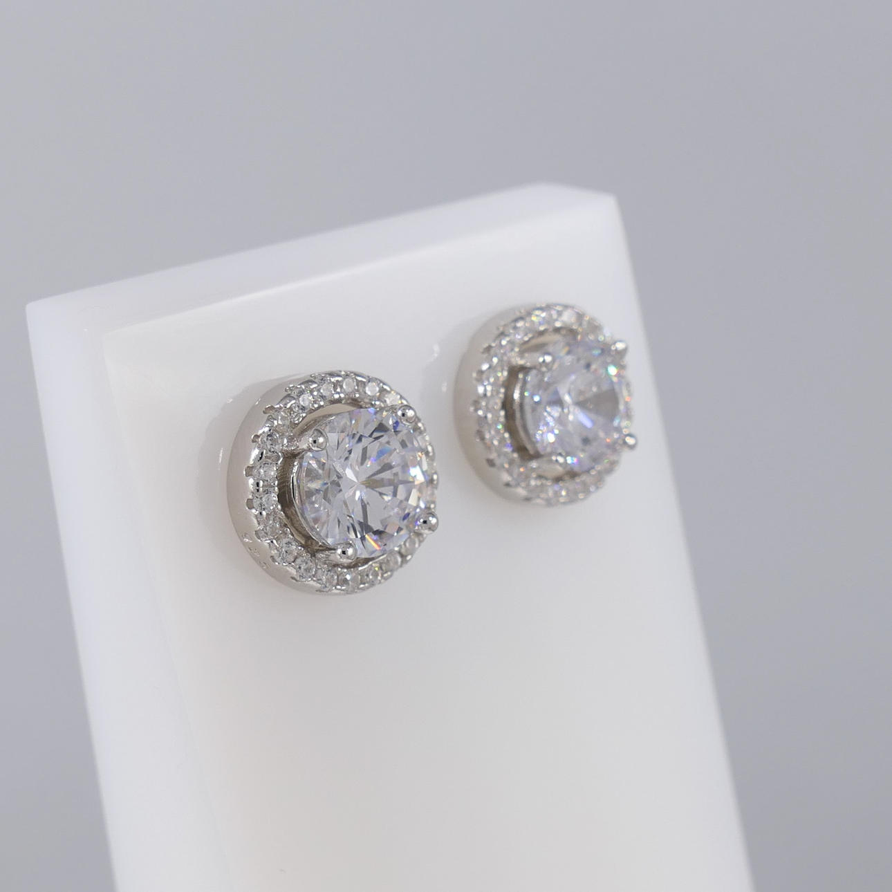 Un par de aretes con halo engastados con circonitas cúbicas blancas de talla redonda, en plata de ley.