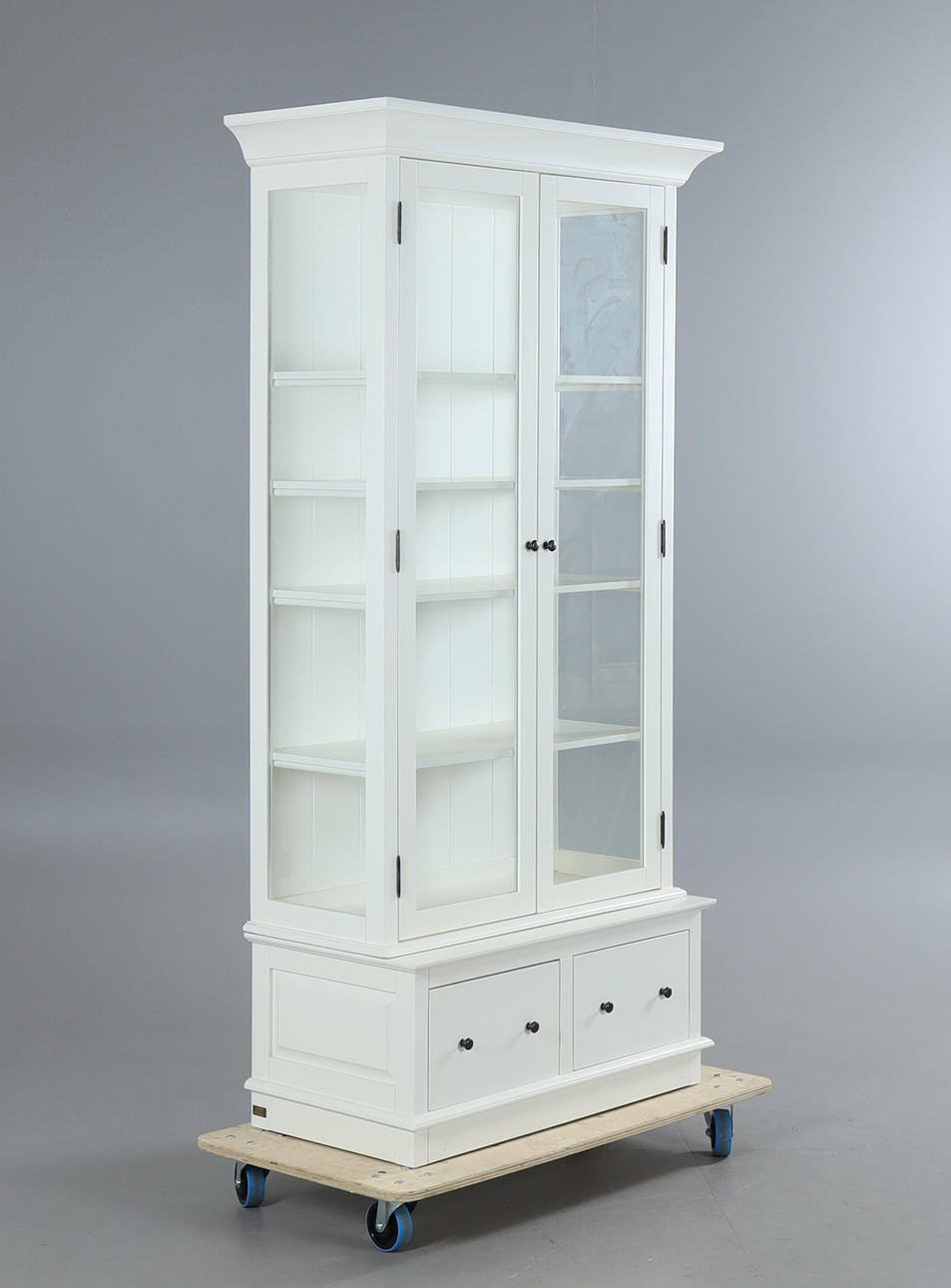 Interior con estantes extraíbles, fondo con 2 cajones, blanco, altura ca 206, 96 x 48 cm.