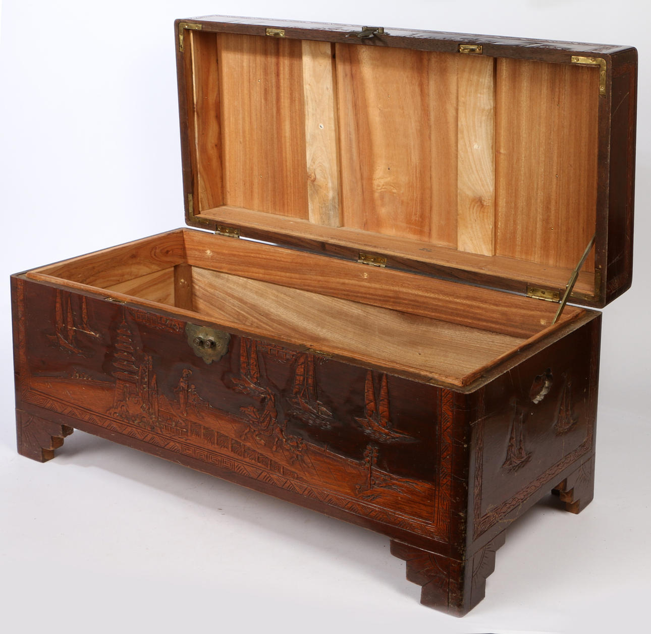 Tallado con figuras, pagodas y barcos, 79 cm de ancho, 38 cm de profundidad, 39,5 cm de alto.