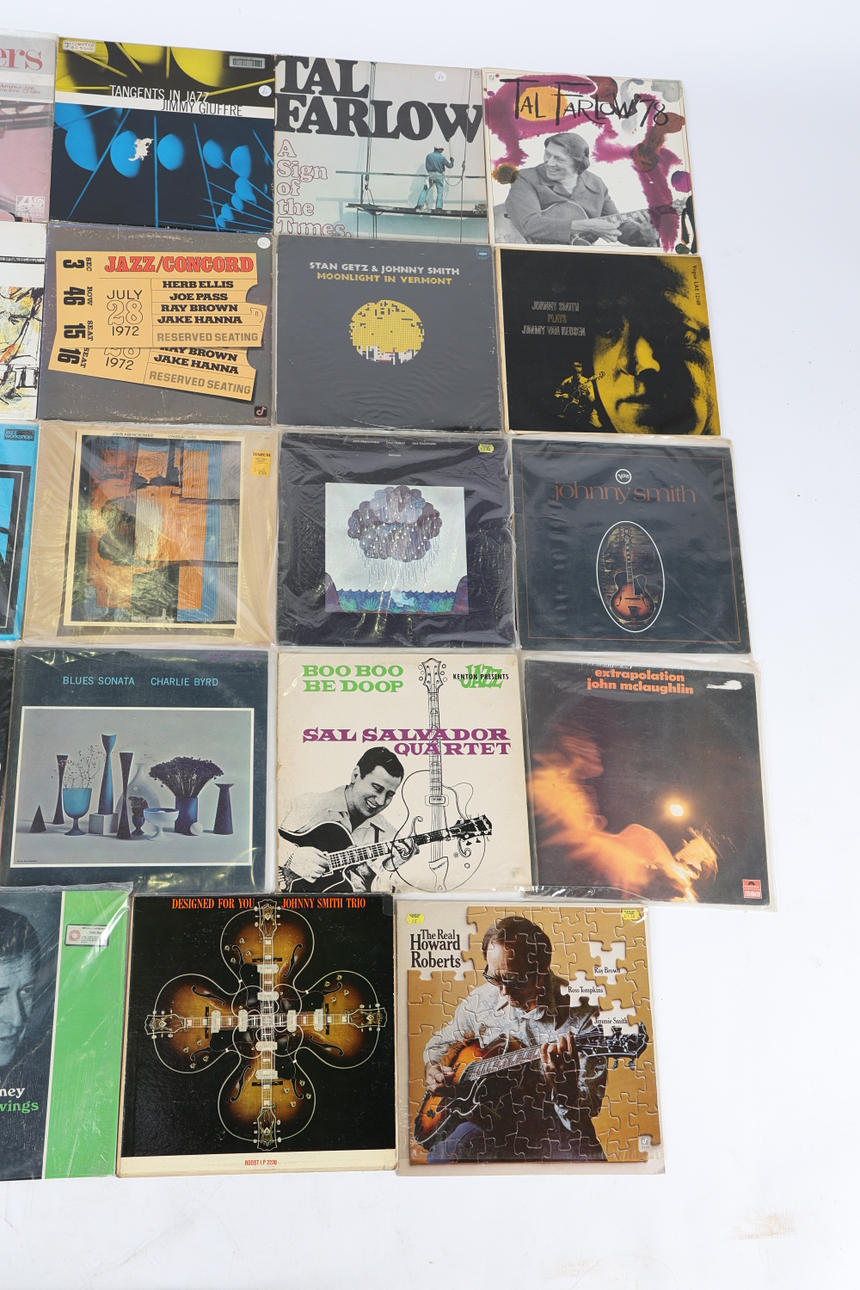 Una colección de LP de jazz con varios maestros de la guitarra, que incluye Tal Farlow (x3), A Sign Of The Times (CJ-26), '78 (CJ-57) y The Legendary Tal Farlow (CJ-266), Jimmy Raney - Strings & Swings (MUSE 5004), Johnny Smith (x6) - Designed For You (ROOST LP 2238), Johnny Smith (SVLP 9185), Kaleidoz Scope (SVLP 9205), Moonlight In Vermont (VJD 539), Toca Jimmy Van Heusen (LAE 12169) y Moods (LAE 12198), El mundo real de Howard Roberts (CJ-53), George Van Eps: Mi guitarra (T 2533), Charlie Byrd (x2) - Blues For Night People (RM 150) y Blues Sonata (OLP 3009), Sal Salvador Quartet - Boo Boo Be Doop (AFF 68), John Mclaughlin - Extrapolación (2343 012), Tiny Grimes - Persiguiendo a Milt (33 017), Dennis Budimir - Solo juntos (JLP 7008), John Abercrombie (x2) - Personajes (ECM 1117) y Gateway (ECM 1061 ST), Jimmy Giuffre (x2) - Four Brothers (590 022) y Tangents In Jazz (AFF60), Jazz Club Guitar (LP 840 035-1) y Jazz/ Concord (CJS-1). (24).