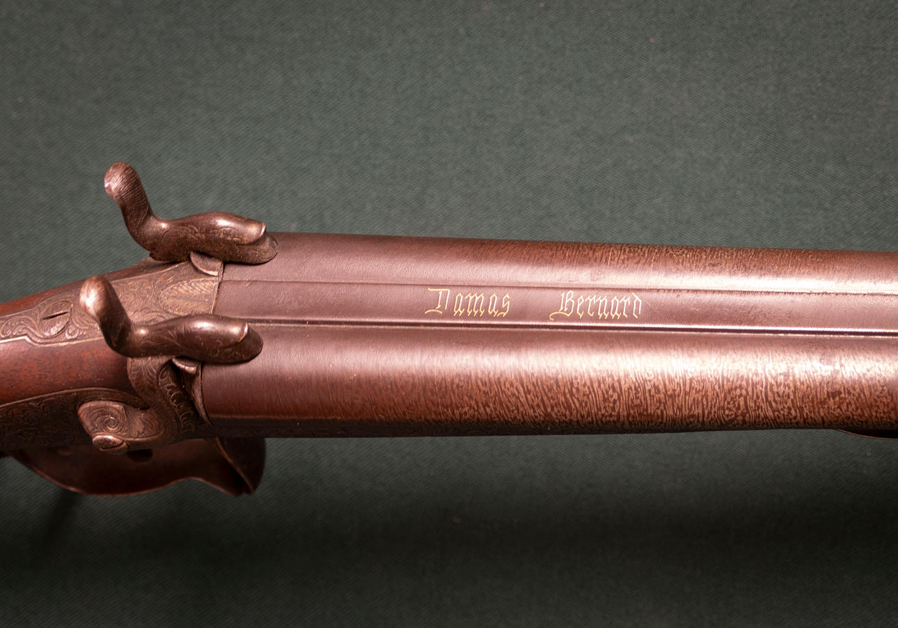 Escopeta belga con machos. Marca Damas Bernard Calibre 16 pines. No adicional 2804 Tubo con polainas de 76 cm de longitud. Función de apertura inusual. Doble gatillo. Jersey térmico decorado. Nevera con base abundantemente grabada. Pistón recto con tapa trasera de acero.
