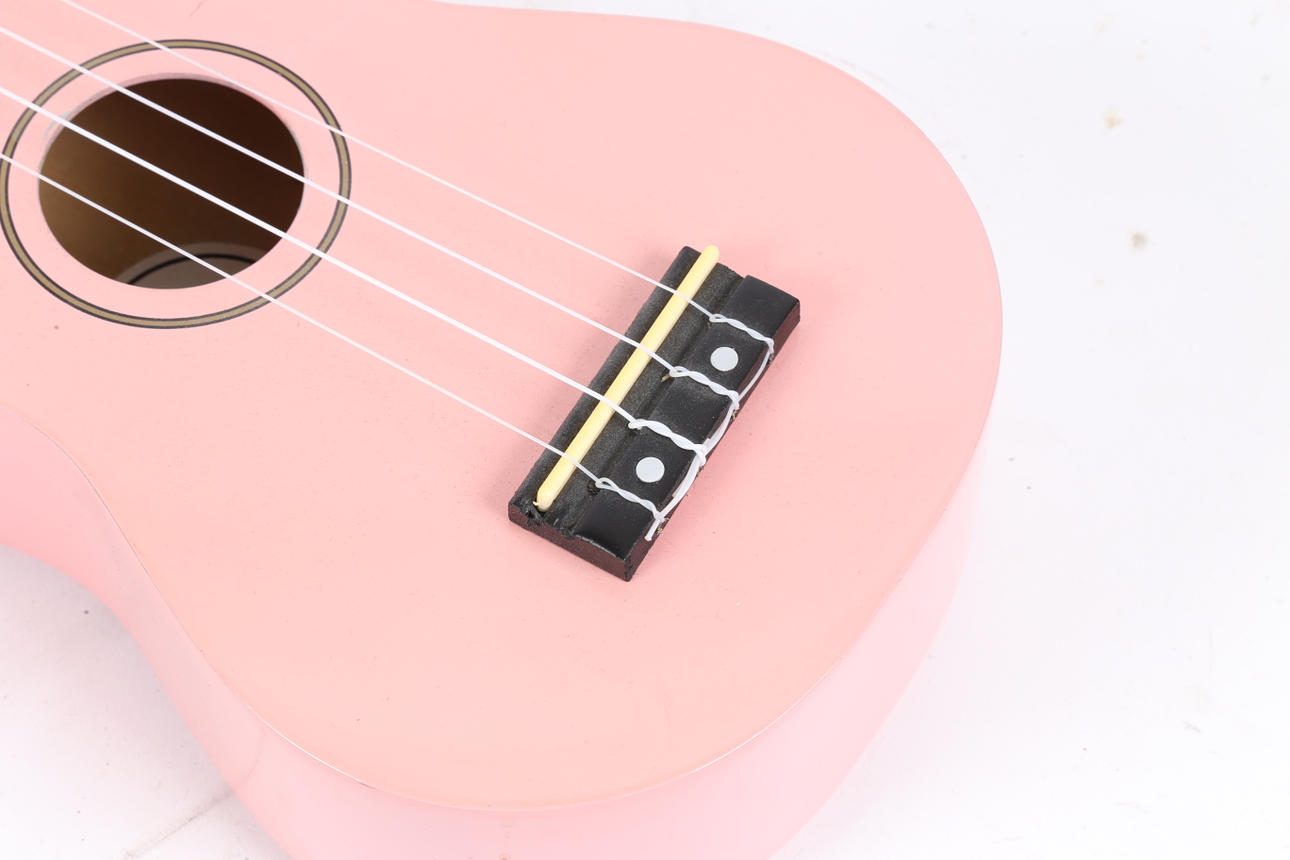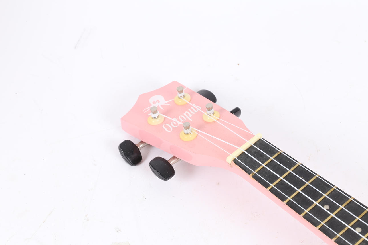 Un ukelele UK25-PK en caja rosa de Octopus, junto con una funda de transporte blanda original, de 53 cm de longitud.