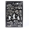 El panel de madera ebonizada con incrustaciones de nácar representa árboles y paisajes con tres figuras en el centro, de 48 cm x 31 cm.