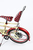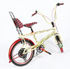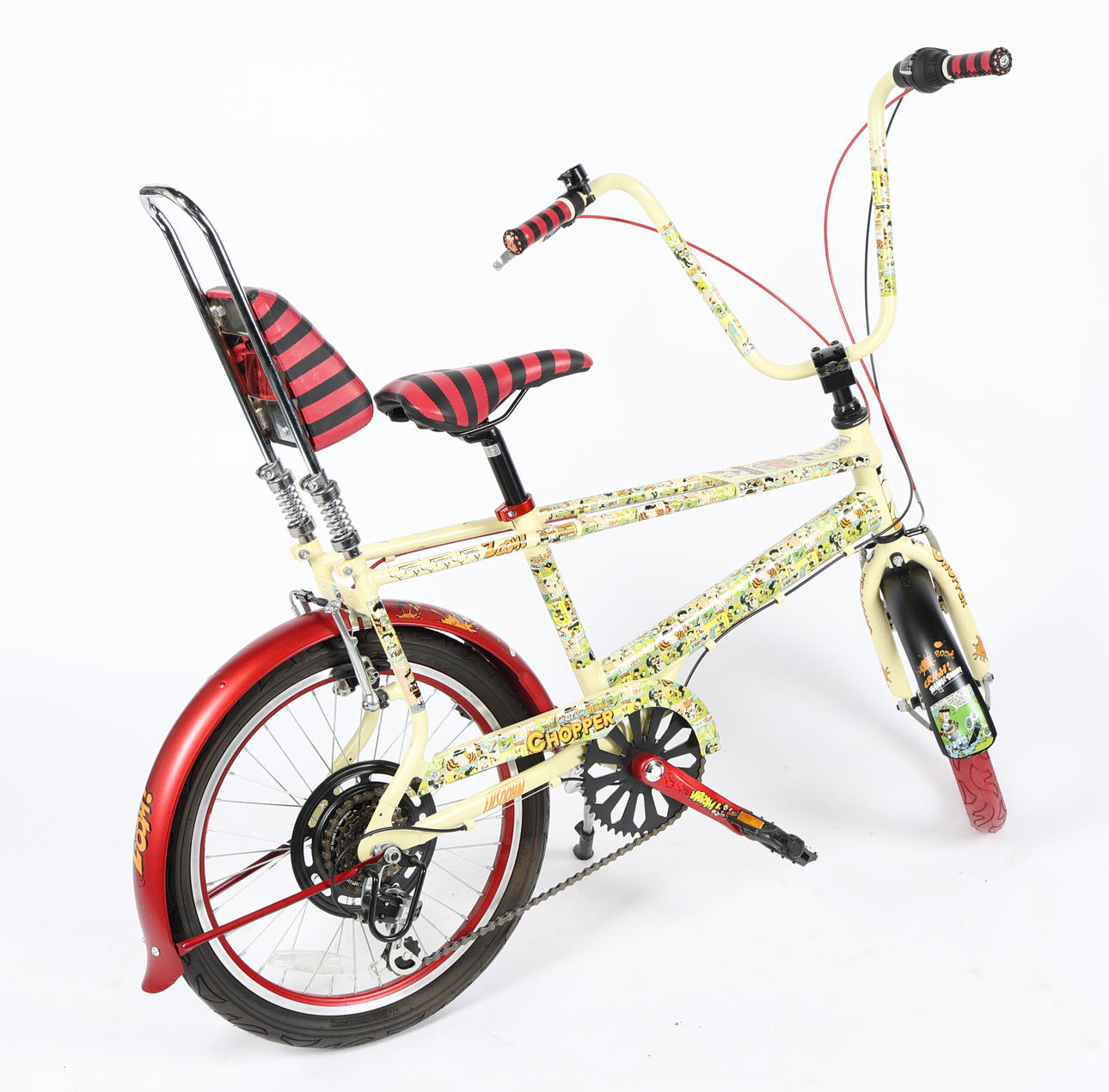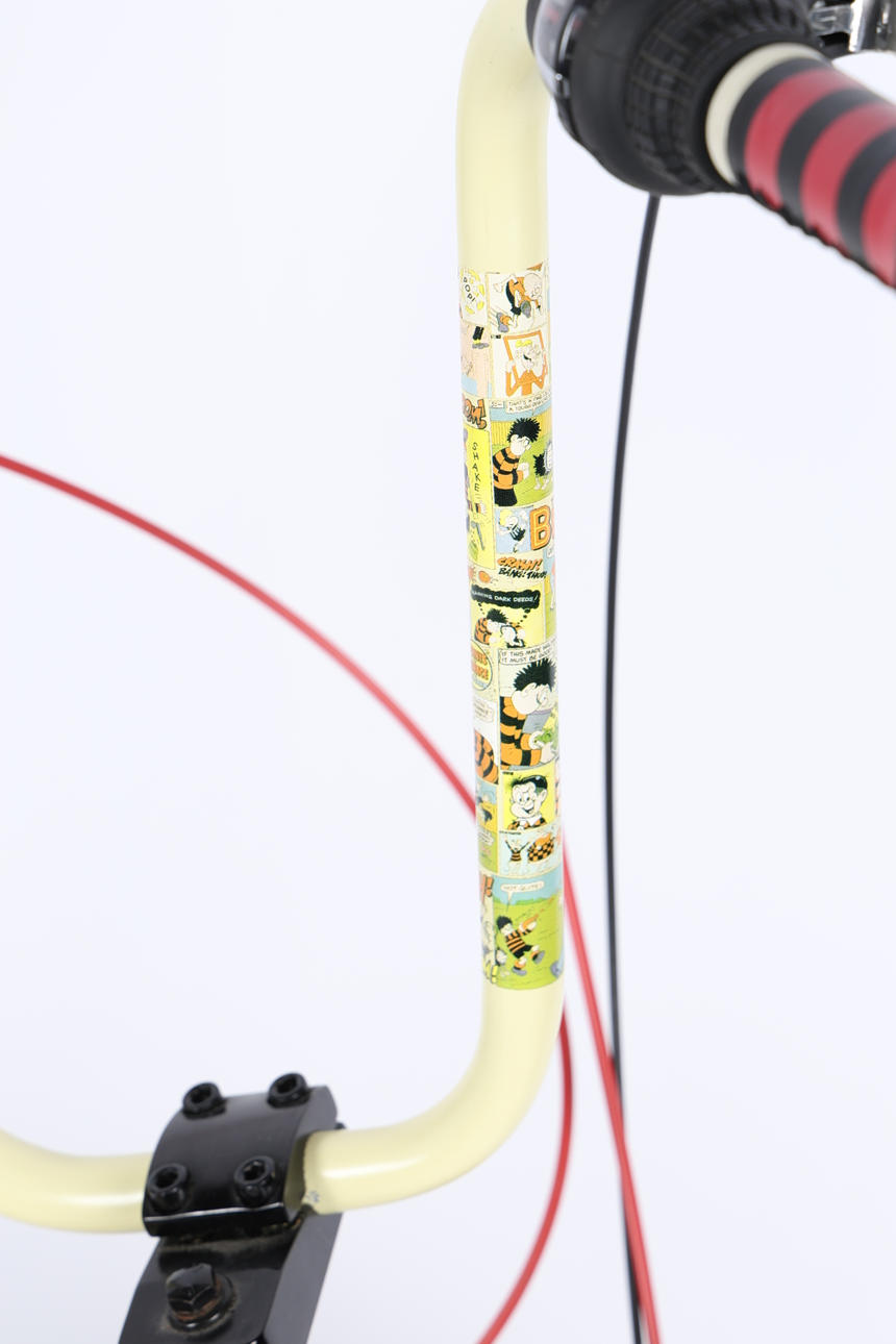 The Beano Chopper, de alrededor de 2014, edición limitada de 400 ejemplares en todo el mundo, con Dennis The Menace y Gnasher, con asiento a rayas rojas y negras, fundas de cables de freno y empuñaduras en el manillar, calcomanías de cómics en el cuadro, neumáticos negros clásicos rojos de 16 pulgadas en la parte delantera y 20 pulgadas en la parte trasera, cambios Shimano de 6 velocidades, aproximadamente 140 cm de longitud total.