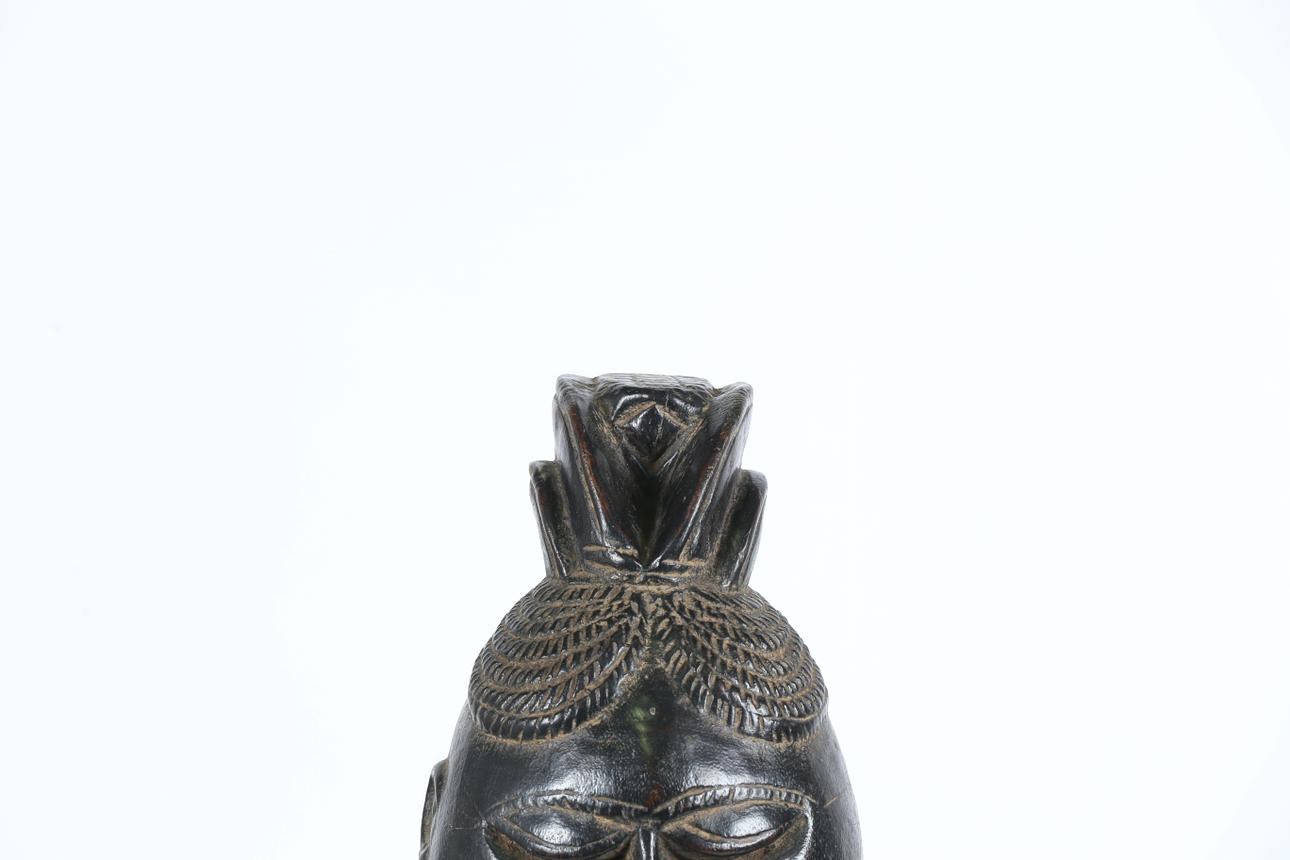 segundo tercio del siglo XX, con una cabeza de doble cara muy tallada y una cara ancha y una base de tela azul, 29 cm de alto y 21 cm de ancho