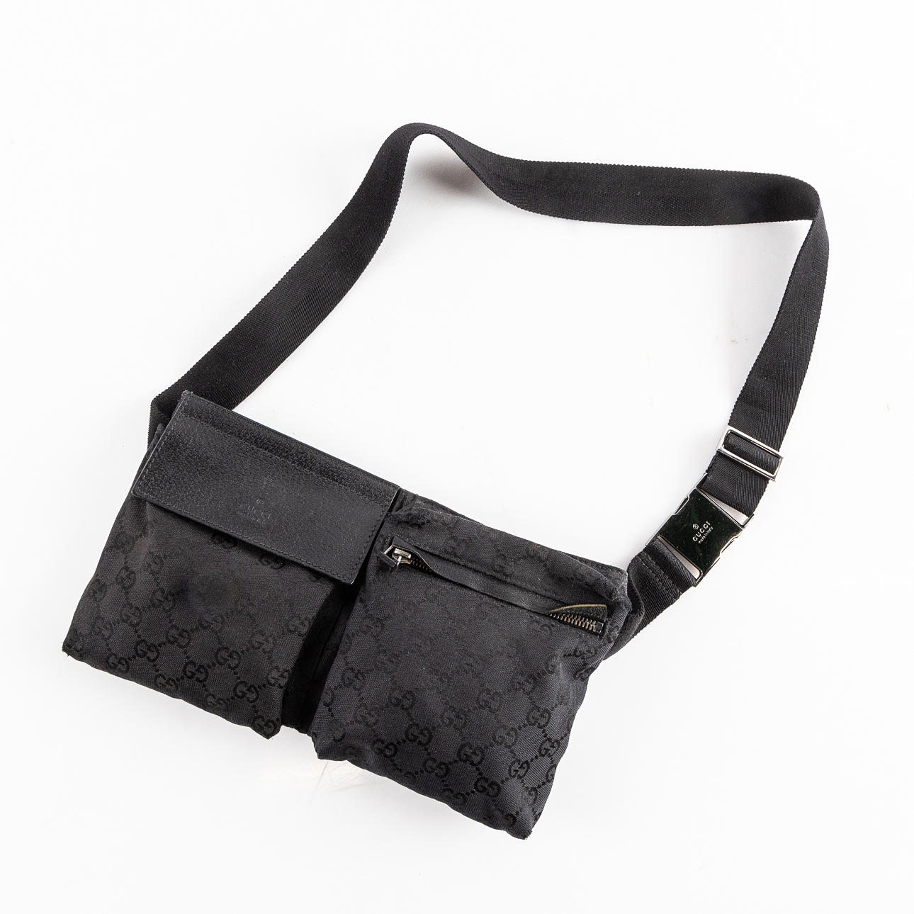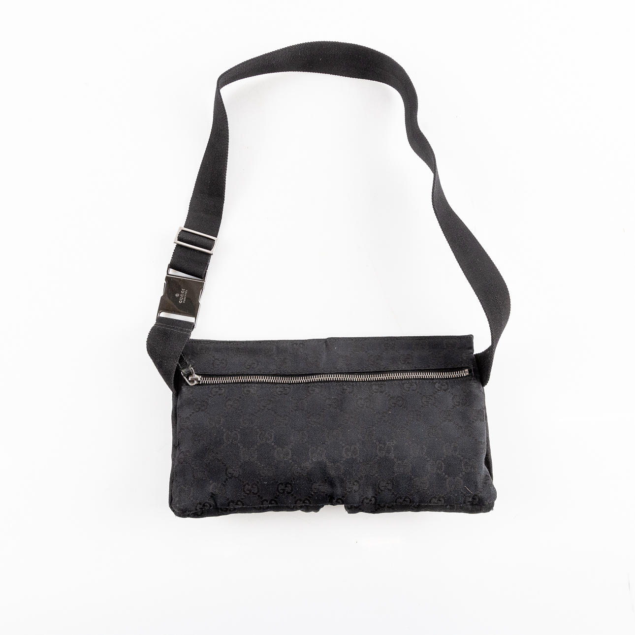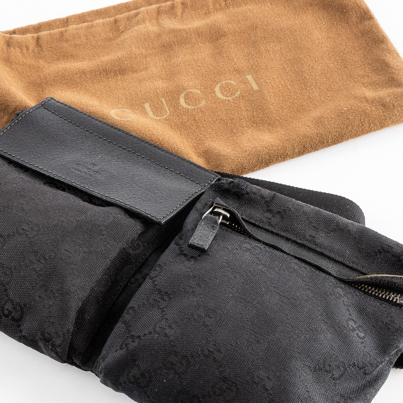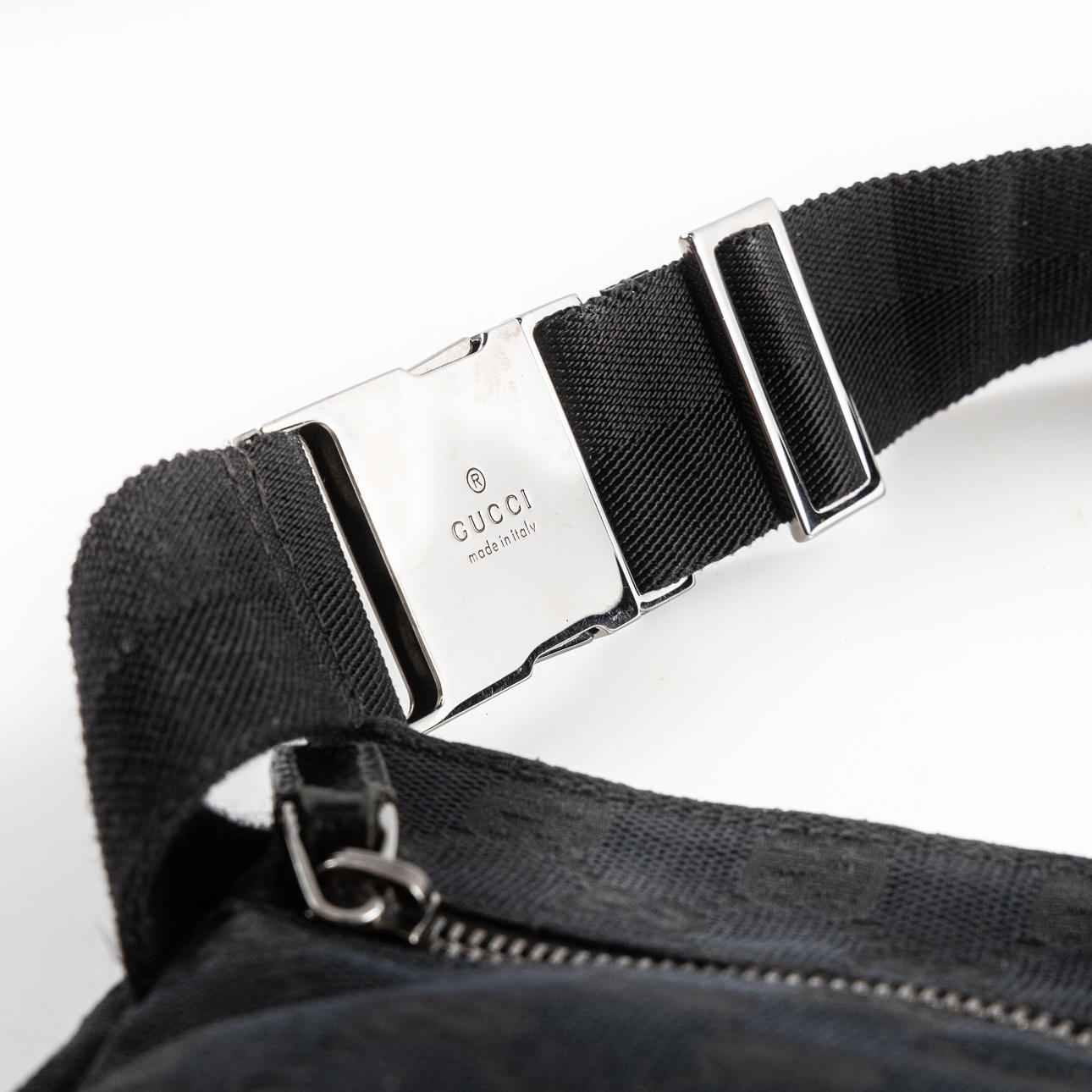 en lona de algodón negra con detalles en piel de cerdo negra. Marcado GUCCI, fabricado en Italia 28566 492783. Correa de cintura ajustable, máx. 113 cm aproximadamente. Incluye bolsa para el polvo. Aprox. 30 x 16 x 2,5 cm.