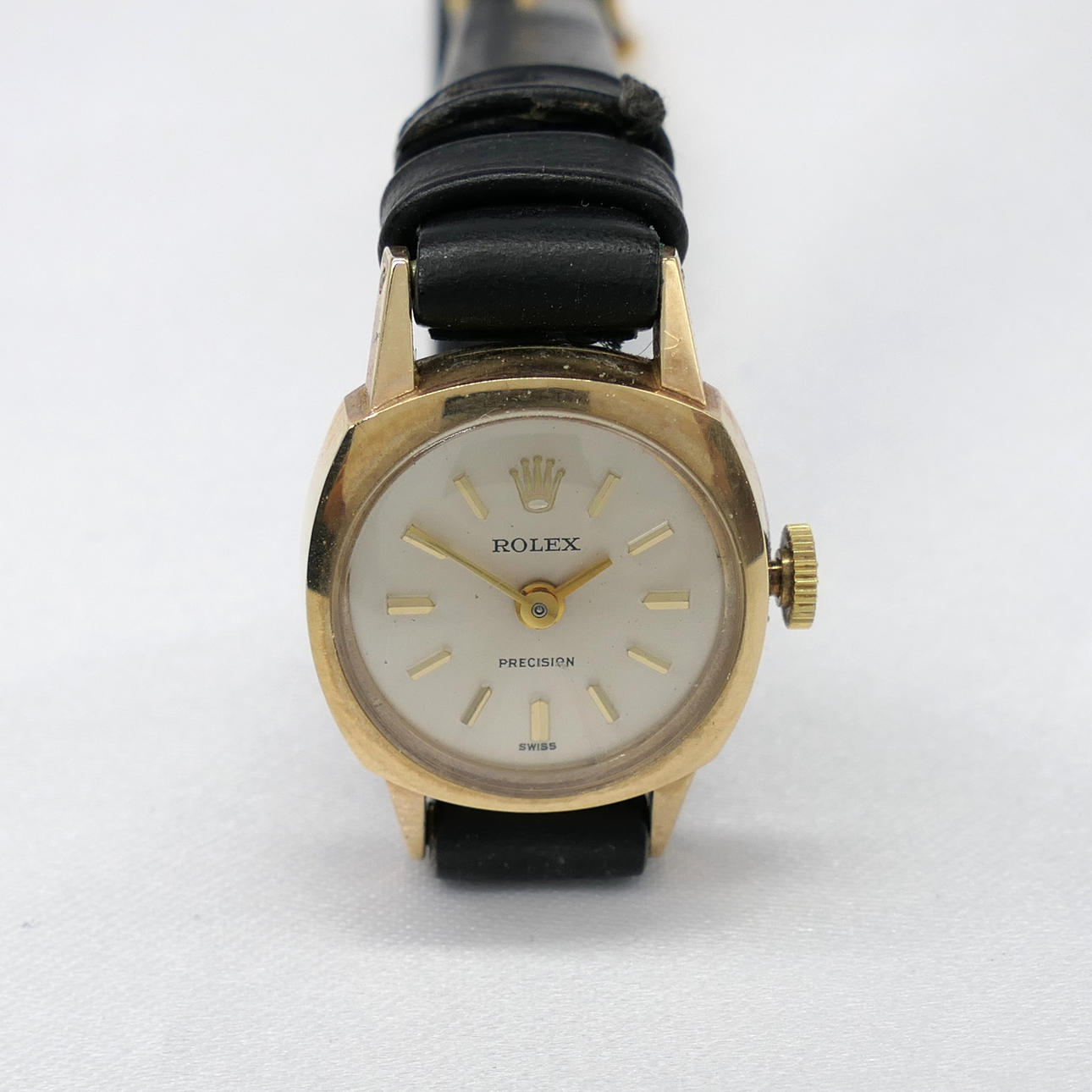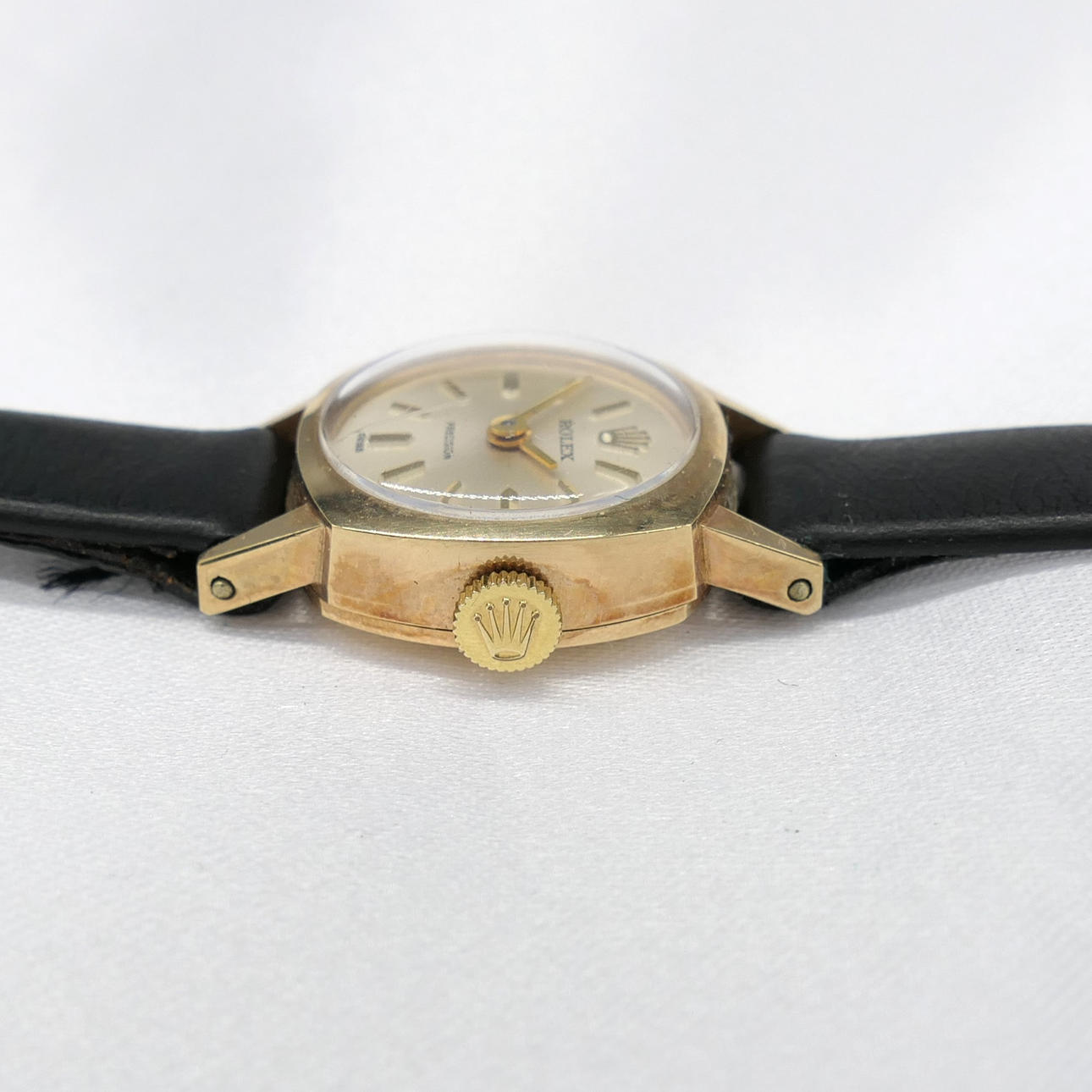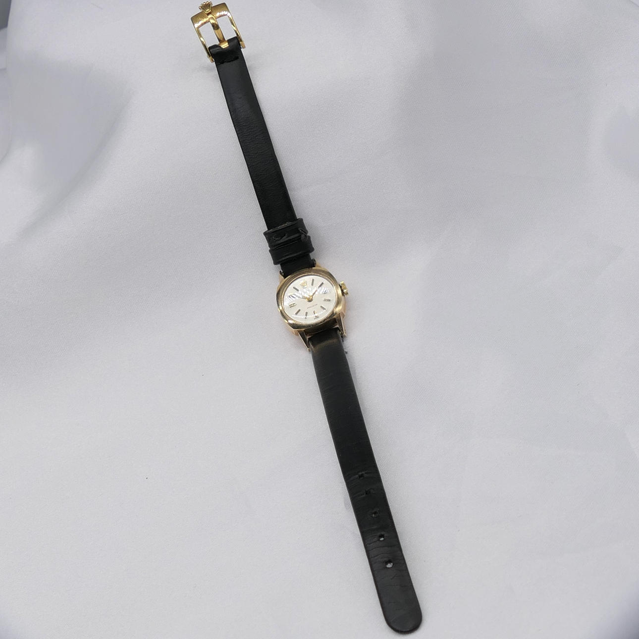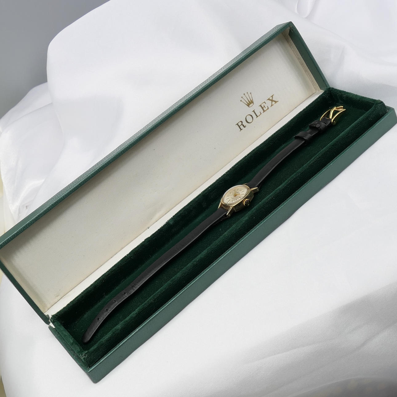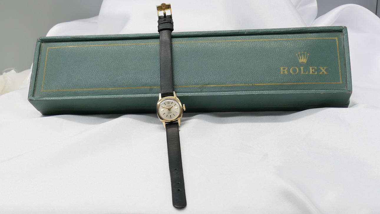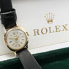 Un reloj de pulsera mecánico Rolex vintage de oro amarillo para mujer con caja original.