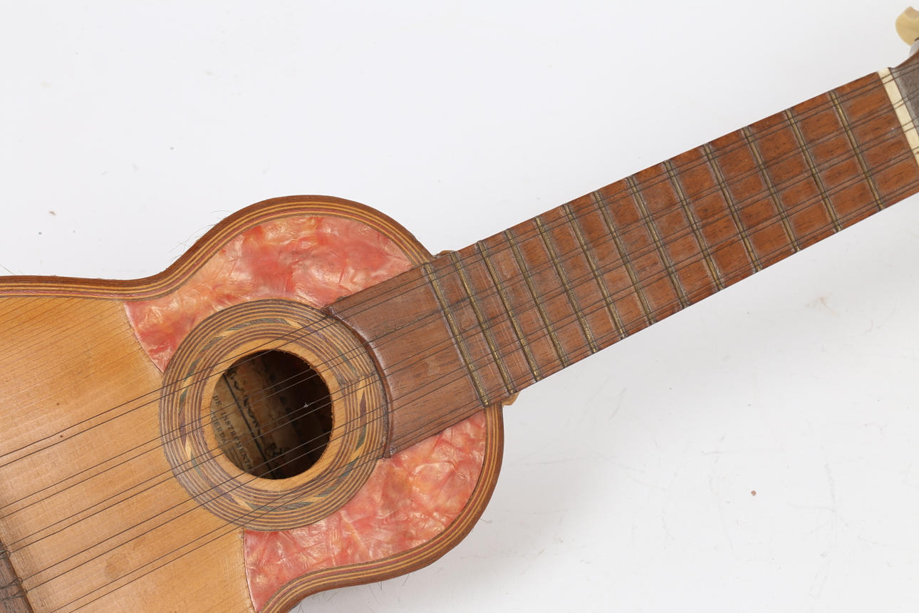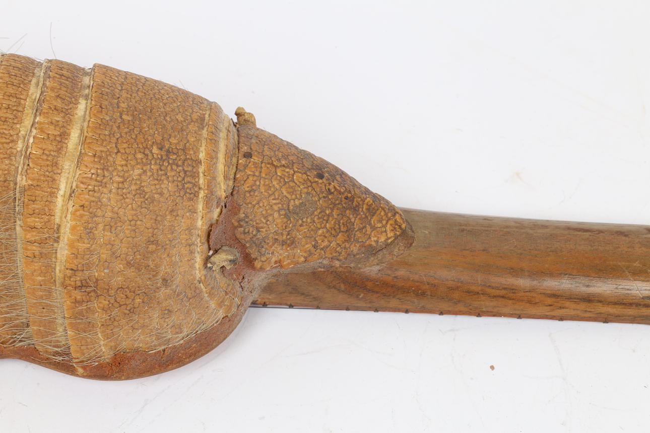 Con una concha de armadillo en la parte posterior, el fabricante etiqueta en el interior «Fabrica De Instrument De Cuerda», de 63 cm de largo.