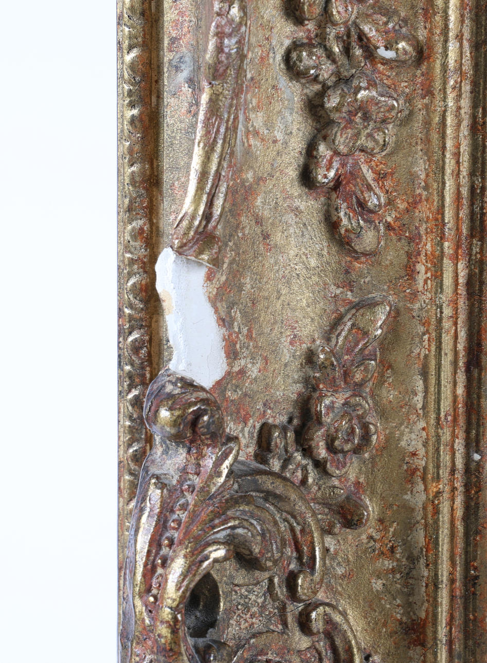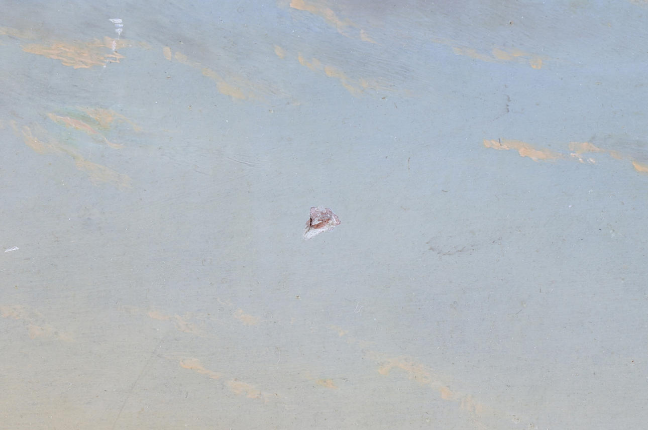 Con un ligero golpe en el centro del panel, pinta un poco fina en algunos lugares con signos de sobrepintura visibles bajo la luz ultravioleta.