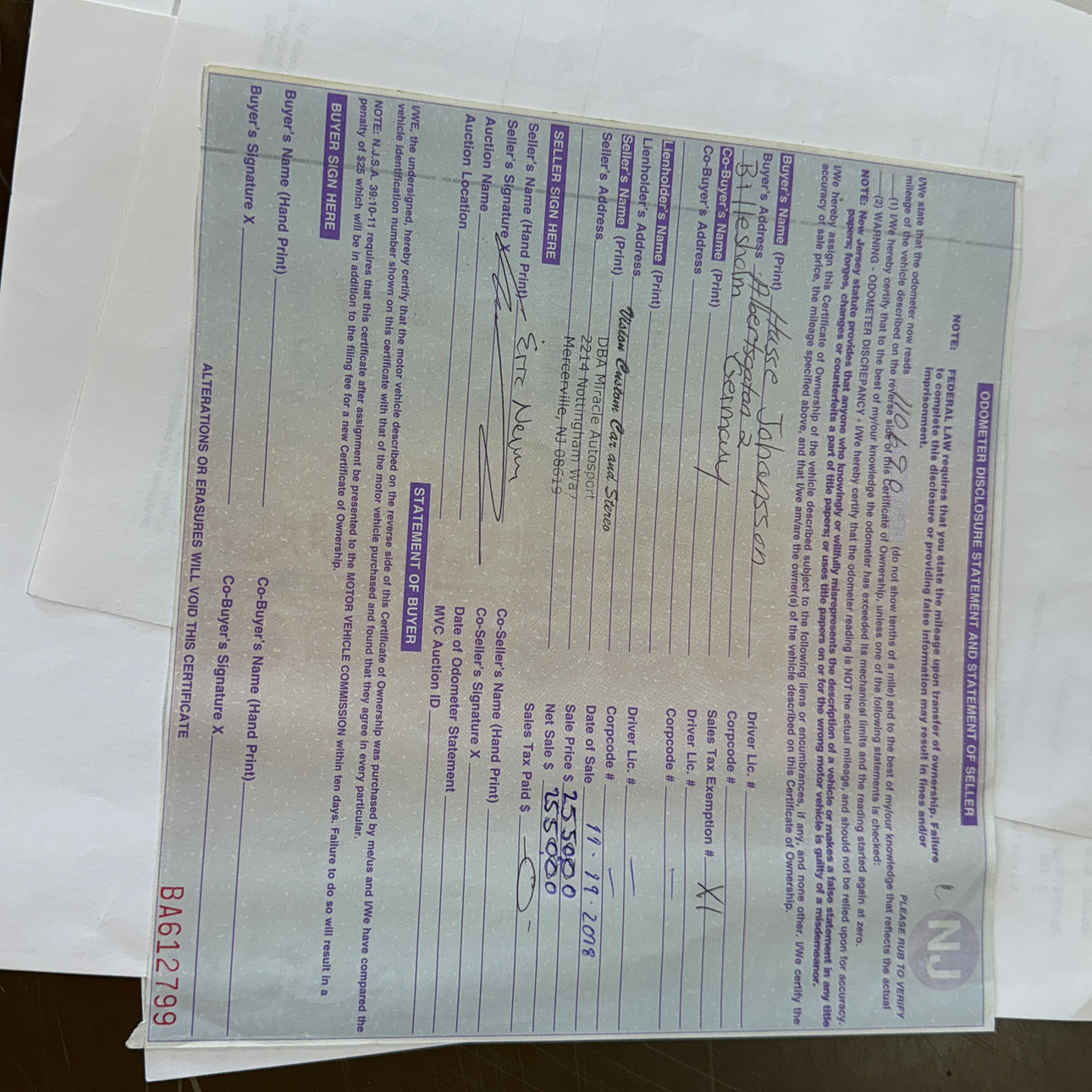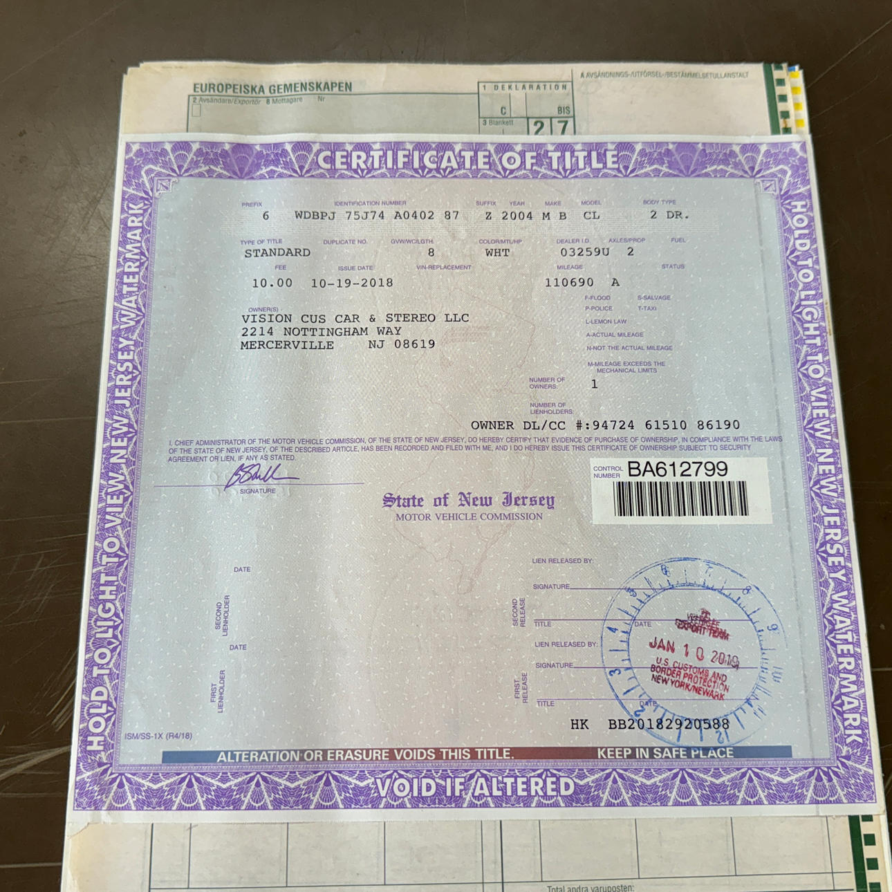 No de registro: no registrado, importado de EE. UU., Nueva Jersey. A continuación figura el certificado de título, etc.
