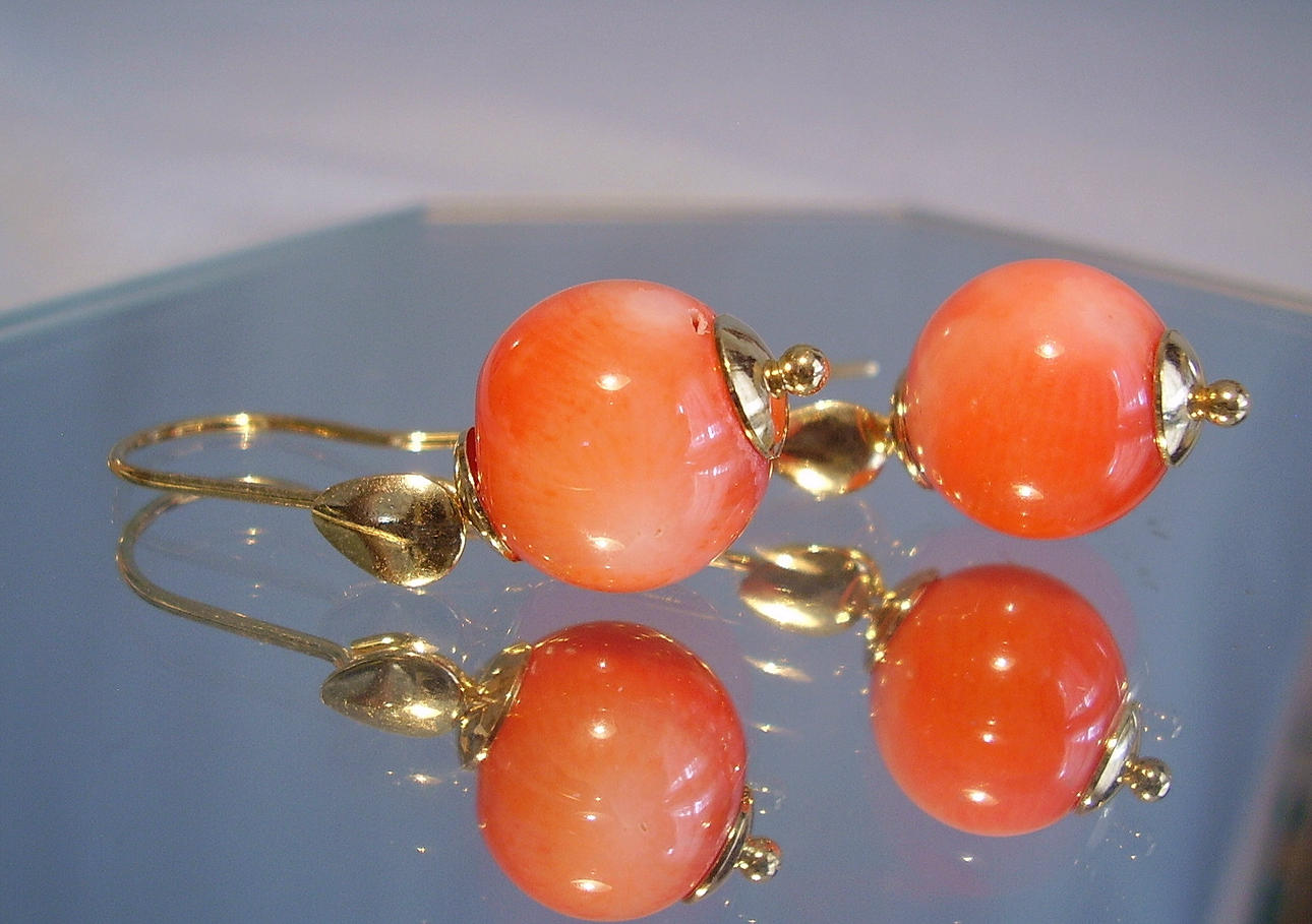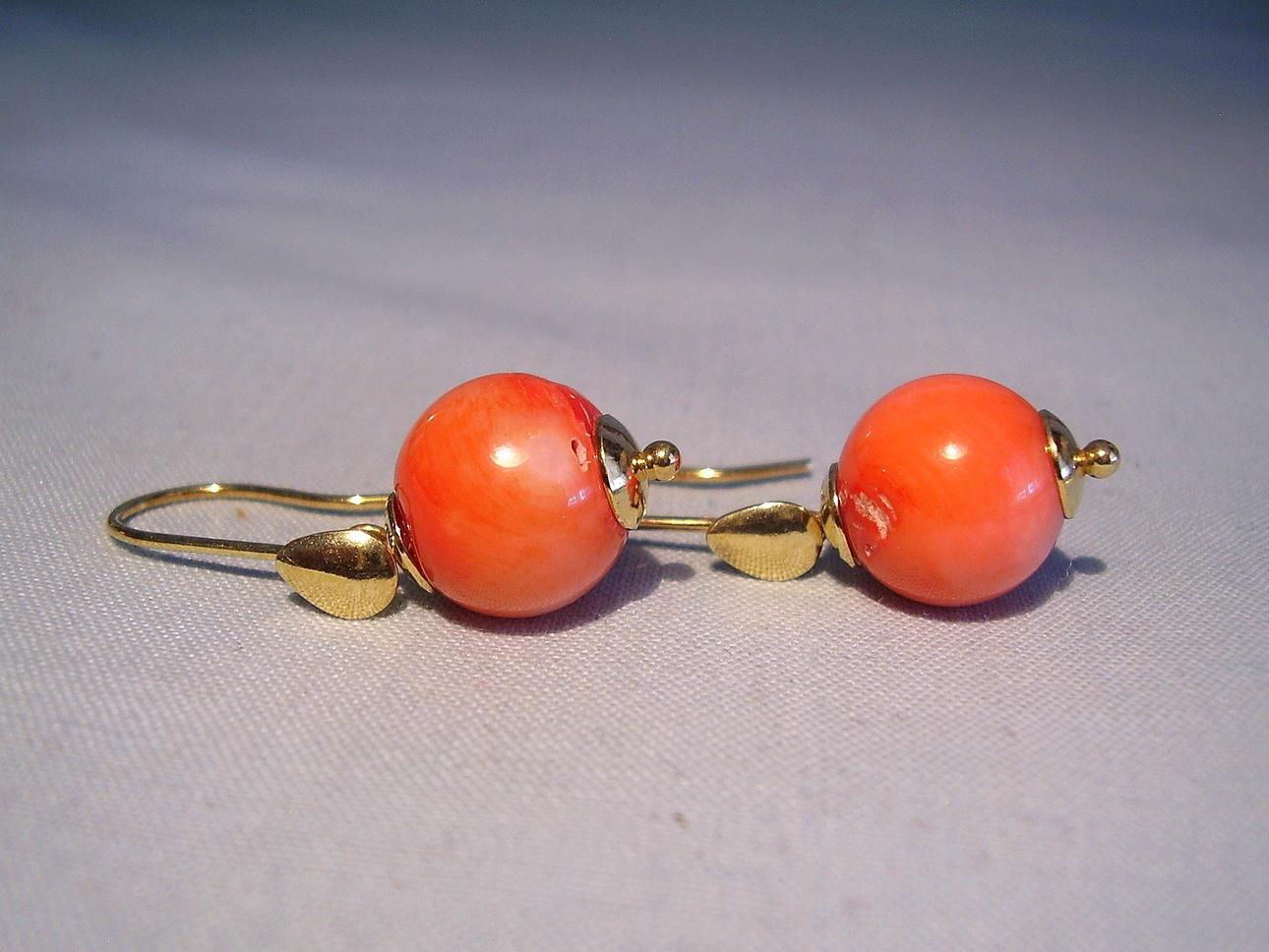 Los pendientes están elaborados en plata 925 y completamente bañados en oro amarillo. Bolas de coral precioso de color salmón con un diámetro de 12,6 mm y una superficie brillante finamente pulida cuelgan de forma flexible de los grandes ganchos para las orejas con los extremos en forma de lágrima.