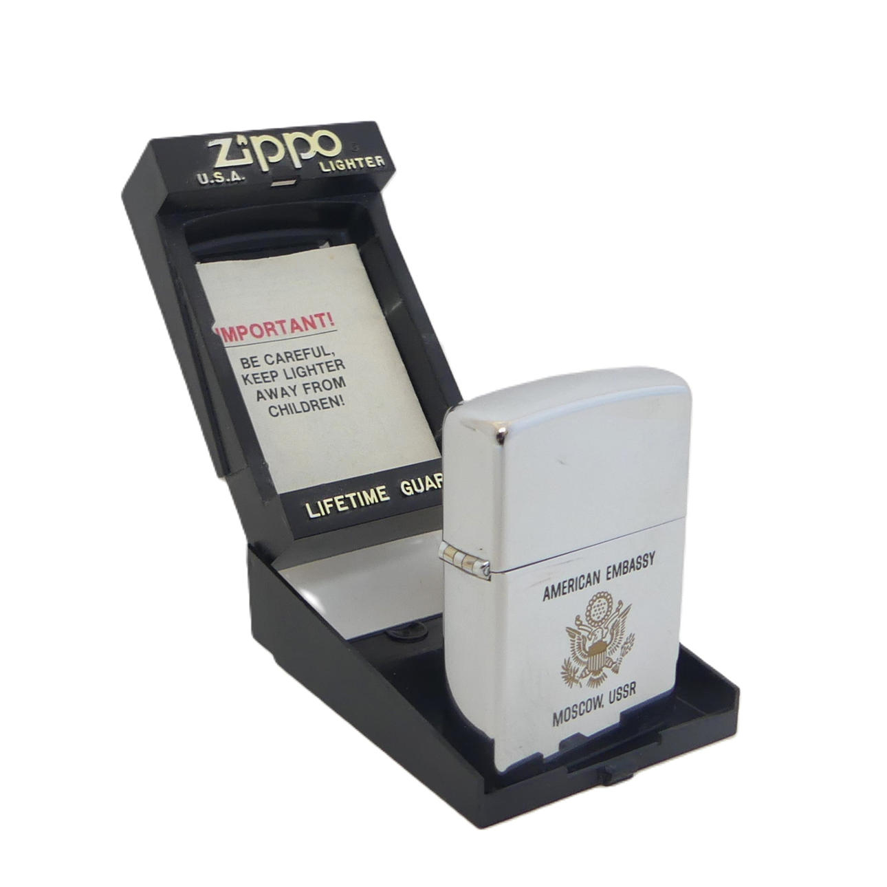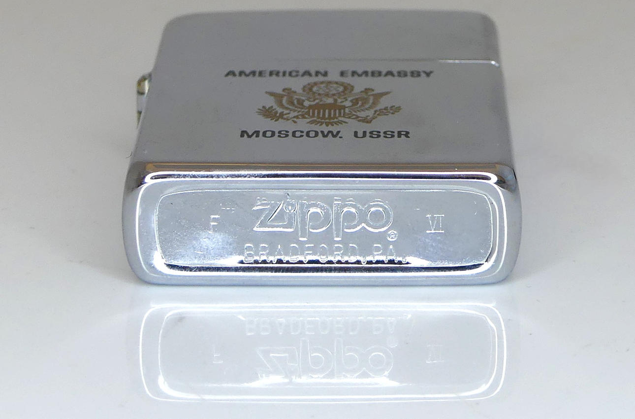 Zippo con funda, marcada con la Embajada de los Estados Unidos, Moscú, URSS.
