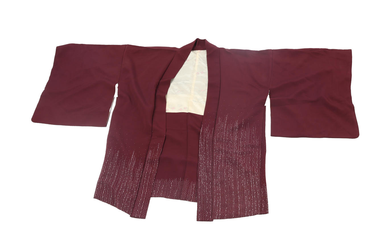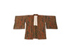 Incluye un estampado haori muy estampado por todas partes en dorado, naranja y verde con varios bloques de motivos florales y de otro tipo, medio forro, pequeños lazos trenzados, un kimono corto de seda negra, un pequeño escudo en la costura trasera, parcialmente forrado con cierres de trenza y un forro haori corto de color burdeos