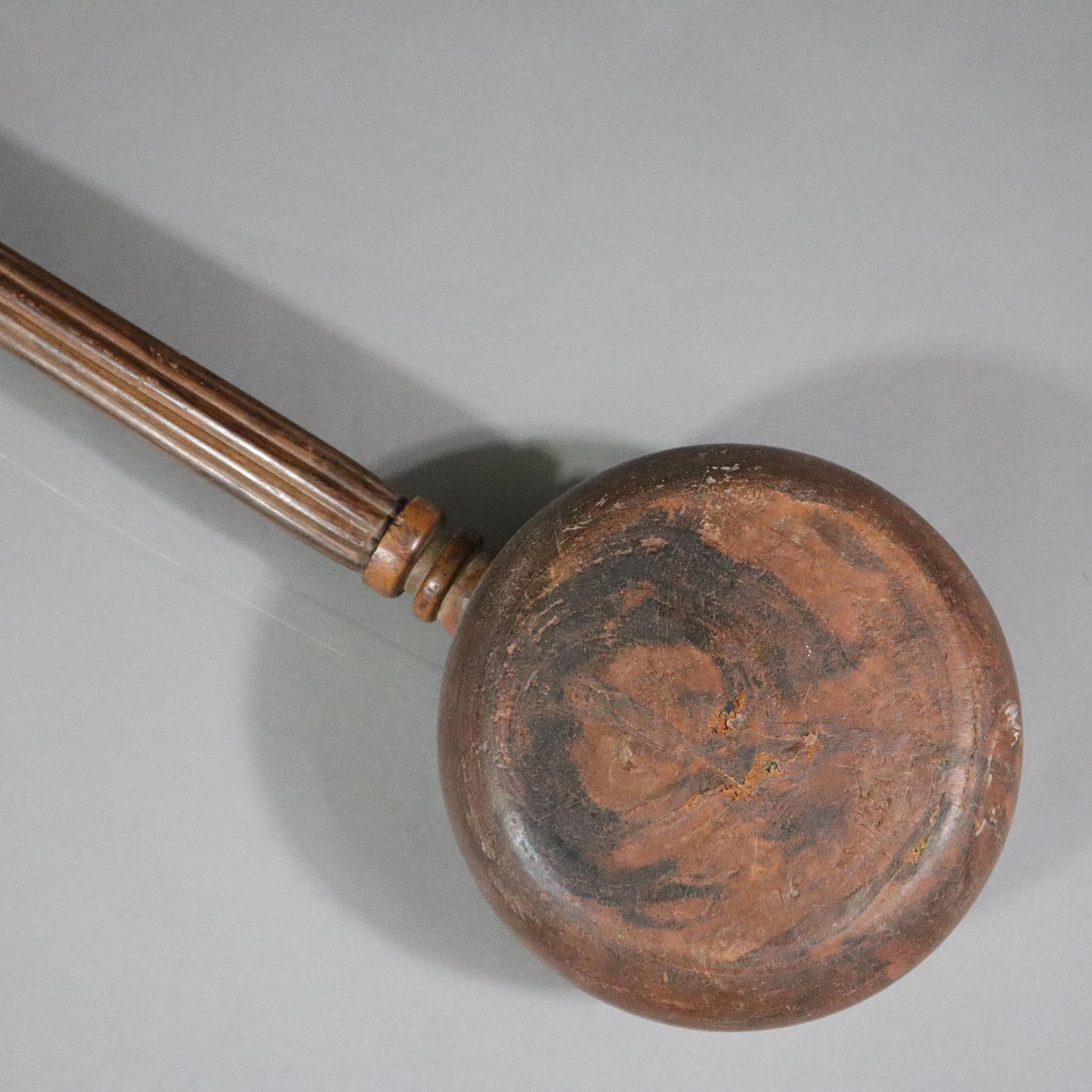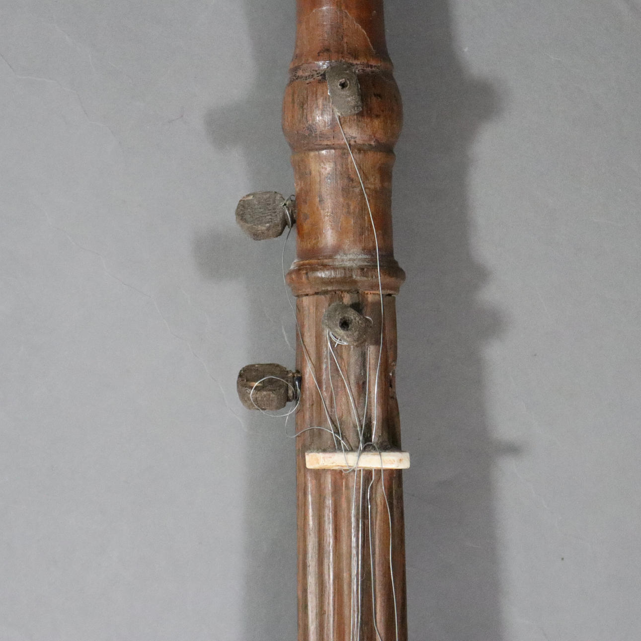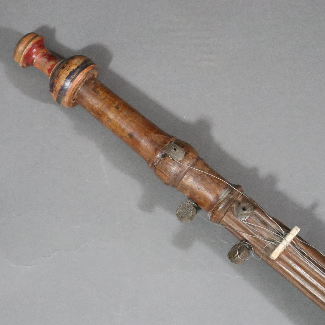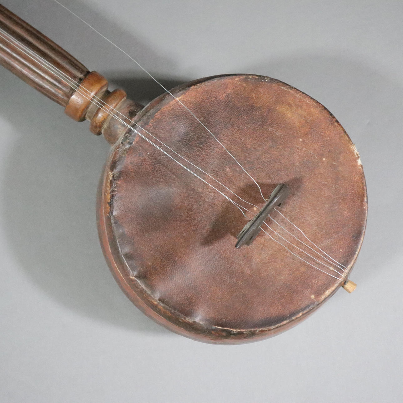 Laúd oriental de cuello largo: instrumento musical tradicional con cuatro cuerdas de acero, cuerpo de madera redondo y aplanado con piel de animal (¿intestino?) strung, L.ca. 11,5 cm.