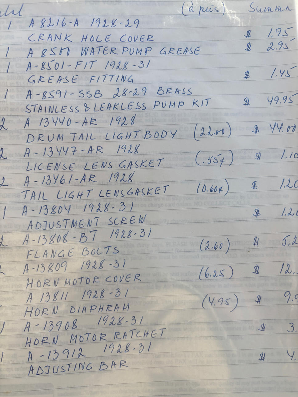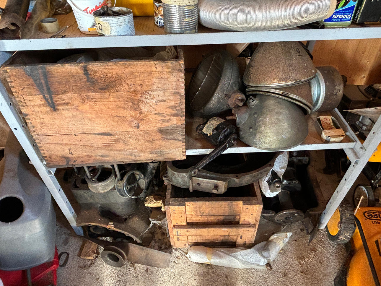 Se incluyen varias piezas de repuesto y manuales. Por ejemplo, la carcasa de la caja de cambios, el bloque del motor, el parachoques, el radiador adicional, la caja de metal, 3 llantas y varios neumáticos de goma, dos cajas de plástico con varias herramientas antiguas.