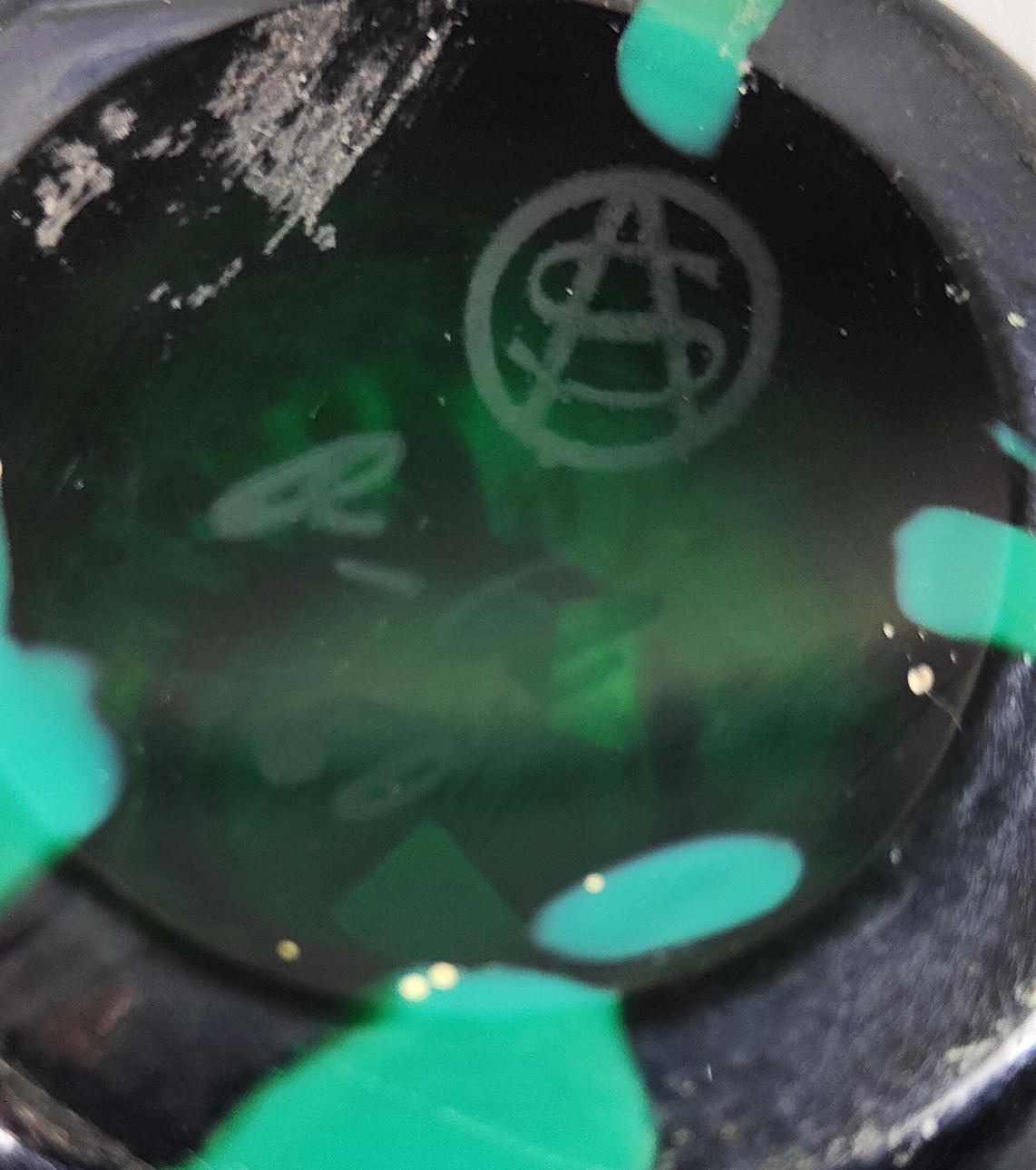 vidrio verde soplado a mano, base jaspeada con monogramas ligados grabados *AS* y *Q-62 150*, el cuerpo que se estrecha hacia abajo con un cuello cilíndrico ancho y corto, acabado en todo su contorno con rasgos entrelazados de color verde opaco y, a veces, lujurioso, H ca. 13 cm.