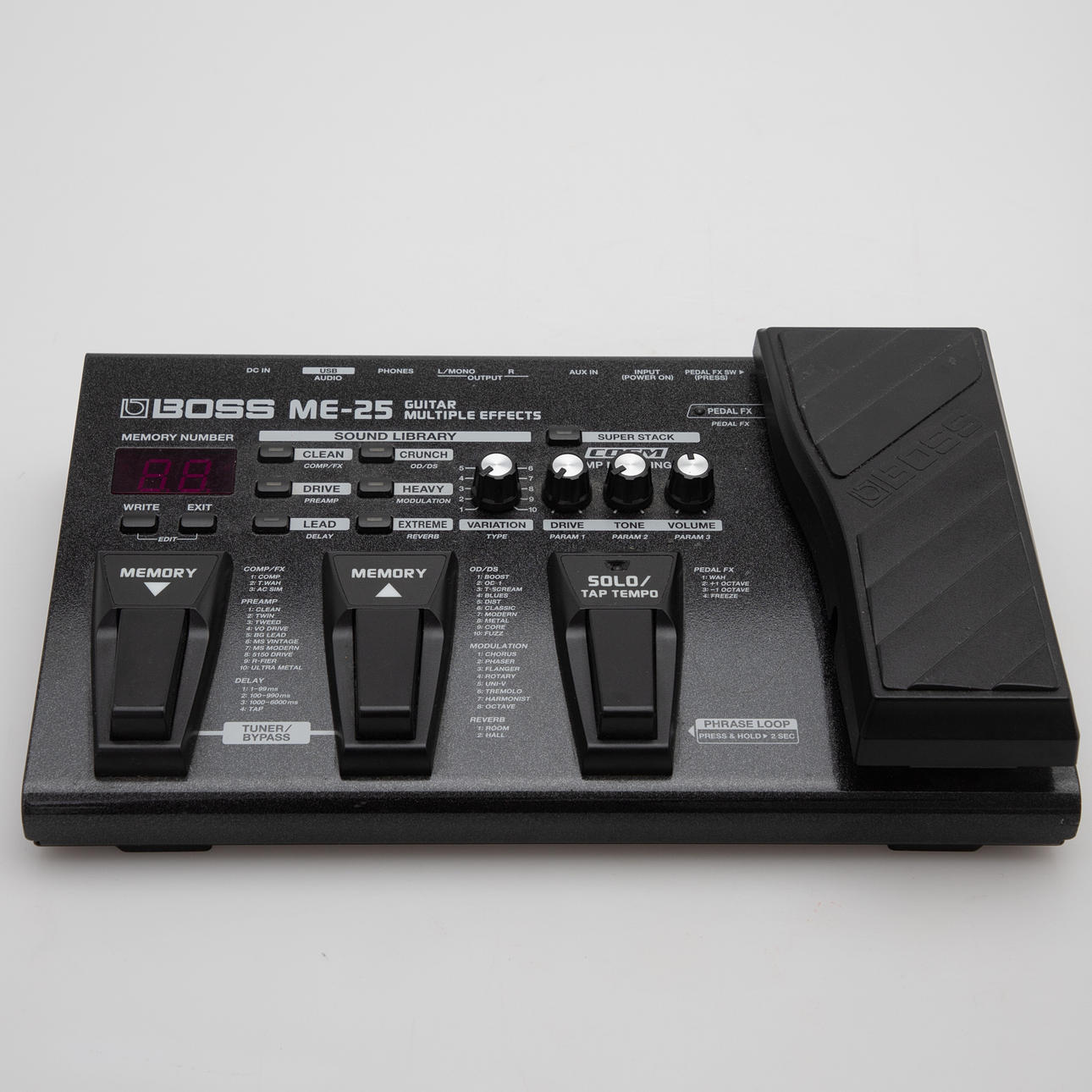 Dispositivo multiefectos para guitarra eléctrica, 'Boss Me-25 Guitar Multiple Effects', con el DVD ROM correspondiente, en carcasa Boss negra, con cuatro pedales, tamaño aproximado 18,5 cm de alto x 30 cm de ancho x profundidad de hasta 7 cm.