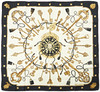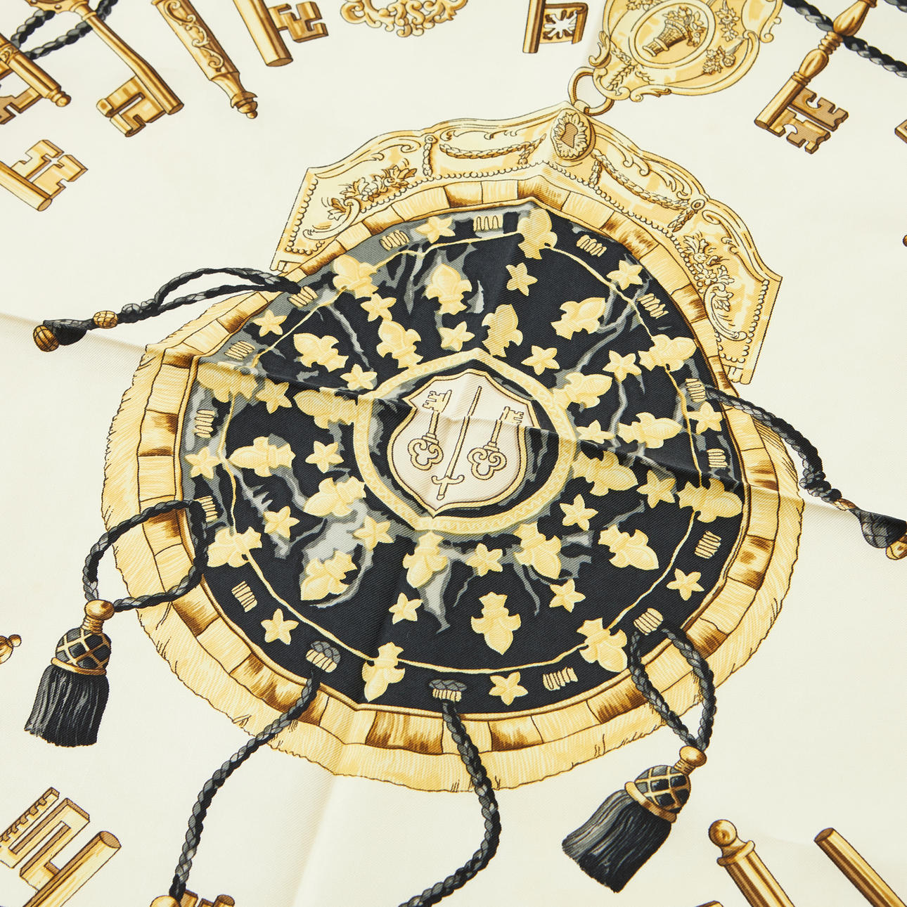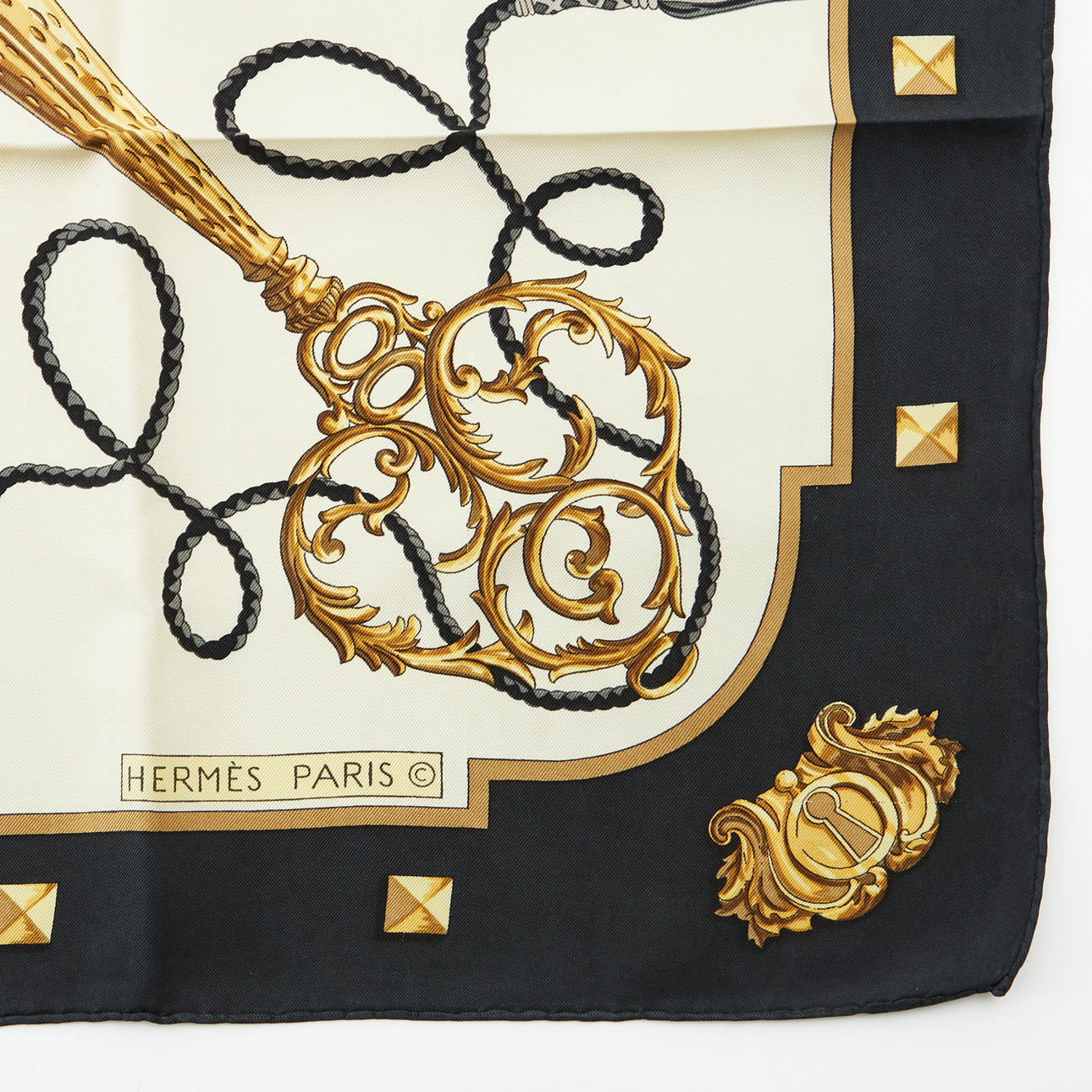 Foulard side, diseño de Cathy Latham en 1965. Llaves en dorado sobre base blanca crema y con marco negro. Etiquetado como «HERMÈS PARIS» y con derechos de autor. Aprox. 90 x 90 cm.