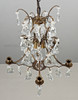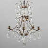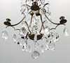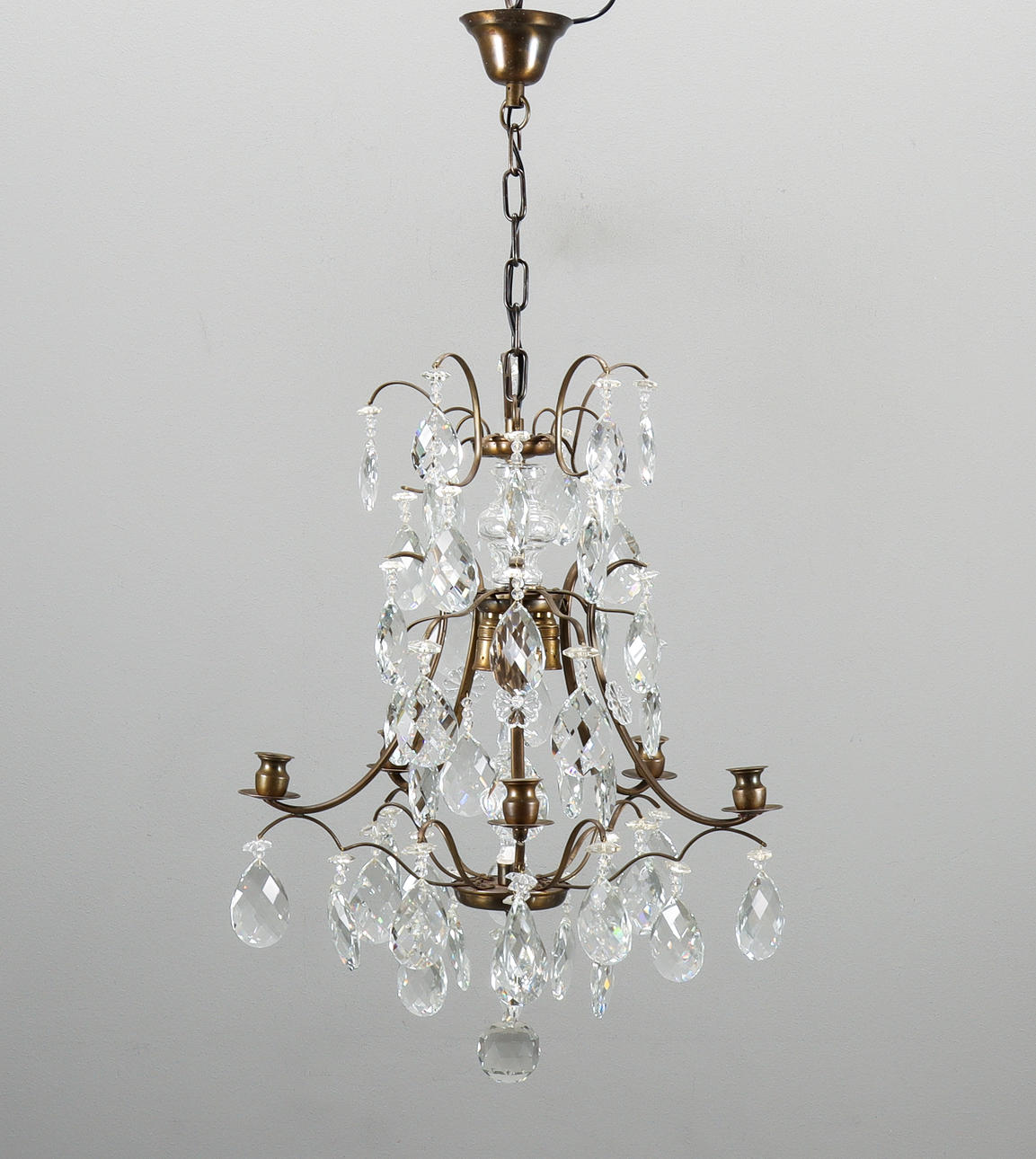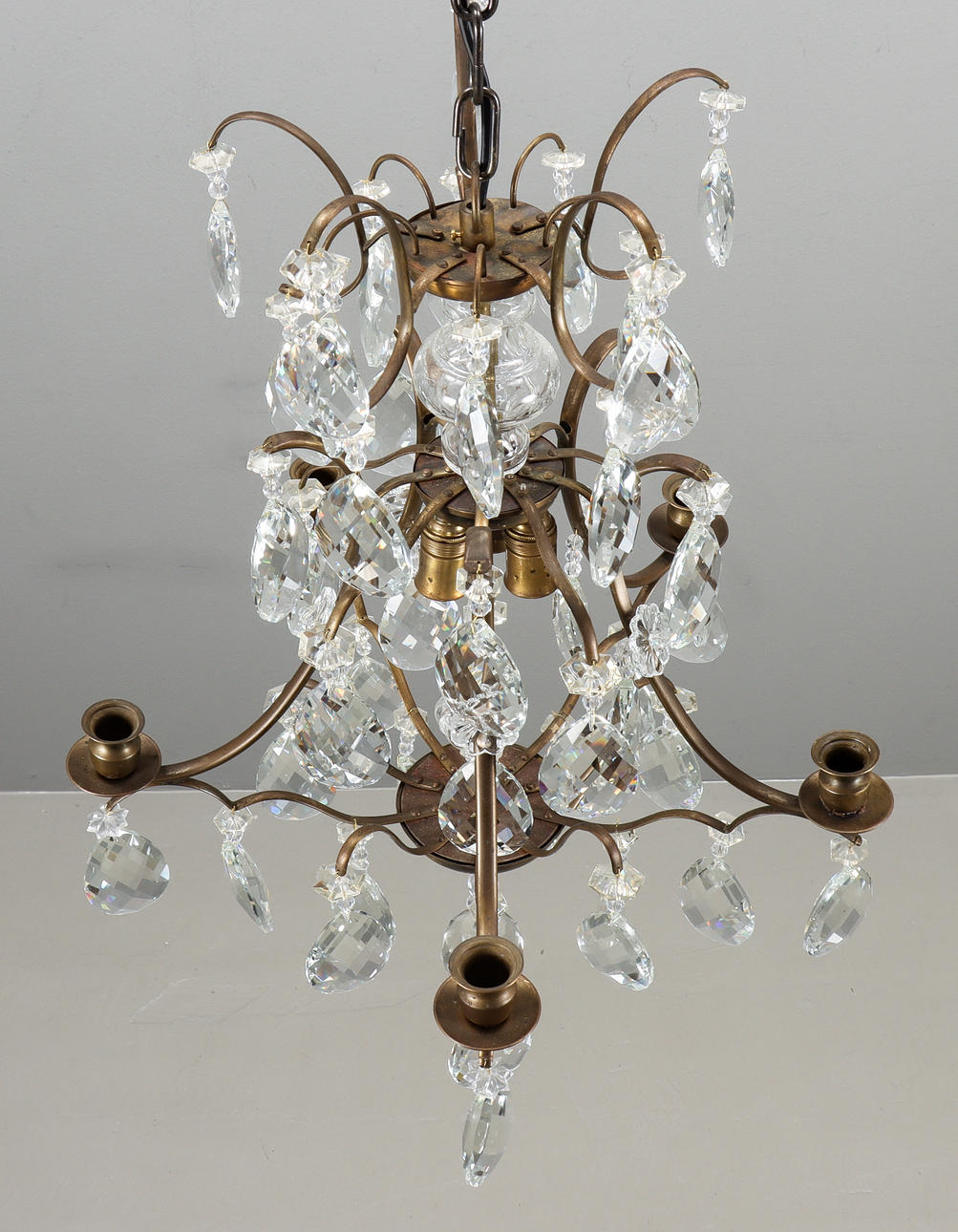 Estructura de latón patinado, prismas de color ahumado. 3 puntos de luz, 5 brazos de luz, electricidad renovada y recién consumida.