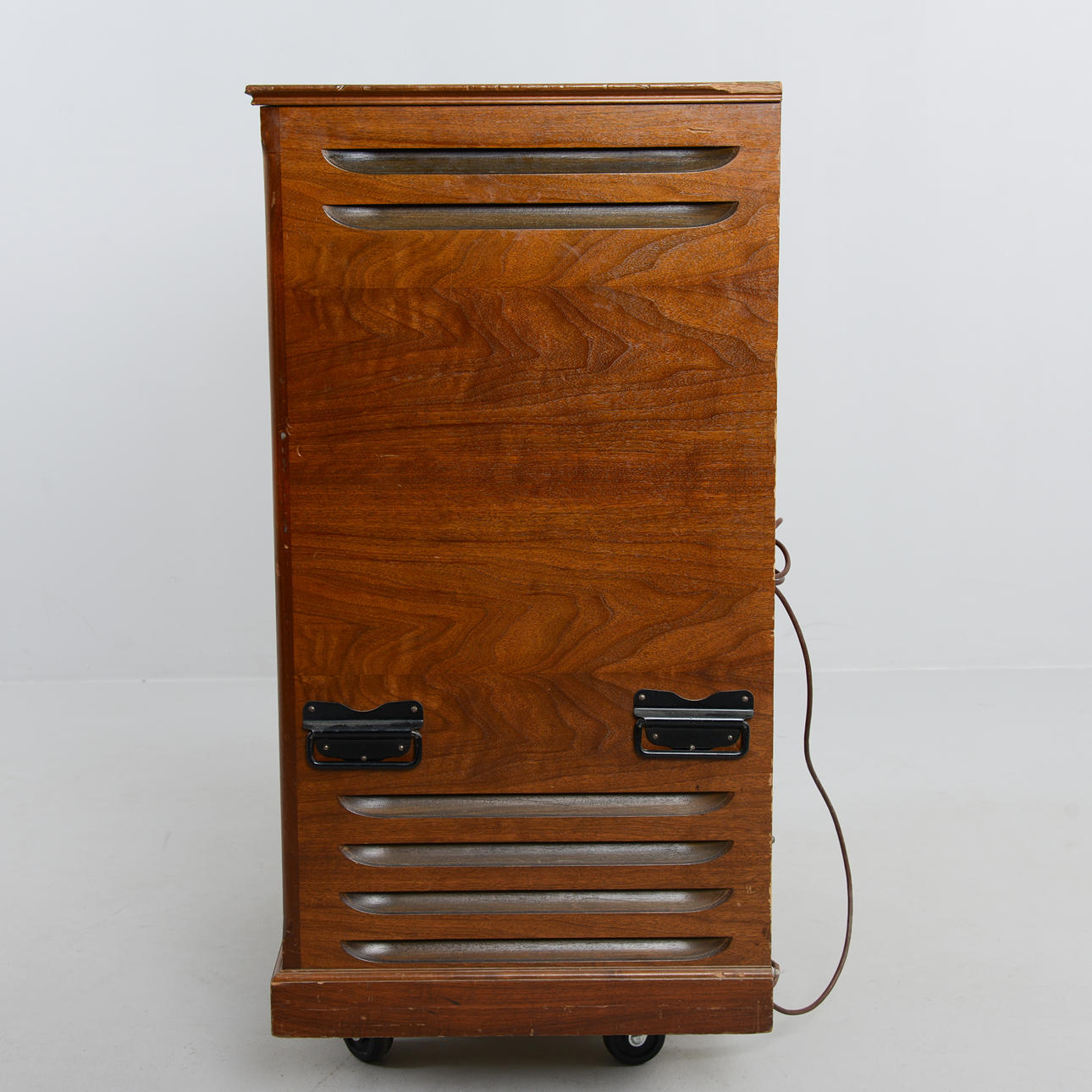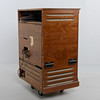 Estado usado, no probado funcionalmente. La rotación funciona, la correa está entera. Daños en un altavoz de rotación en baquelita. Tamaño: 97 x 74 x 52 cm.