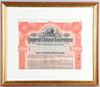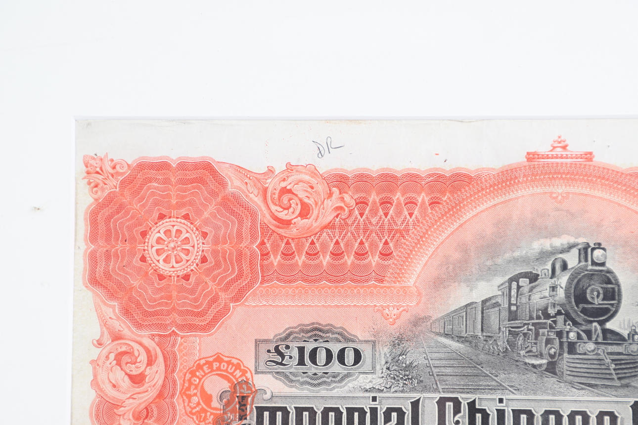 Un certificado de acciones del Gobierno Imperial Chino enmarcado, una fianza de 100 libras y montado en un marco. Marco: 51,5 cm x 44 cm.