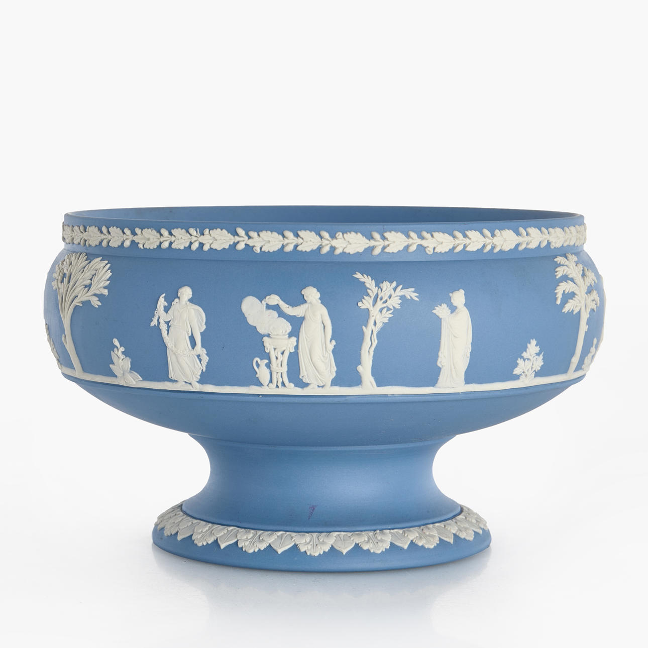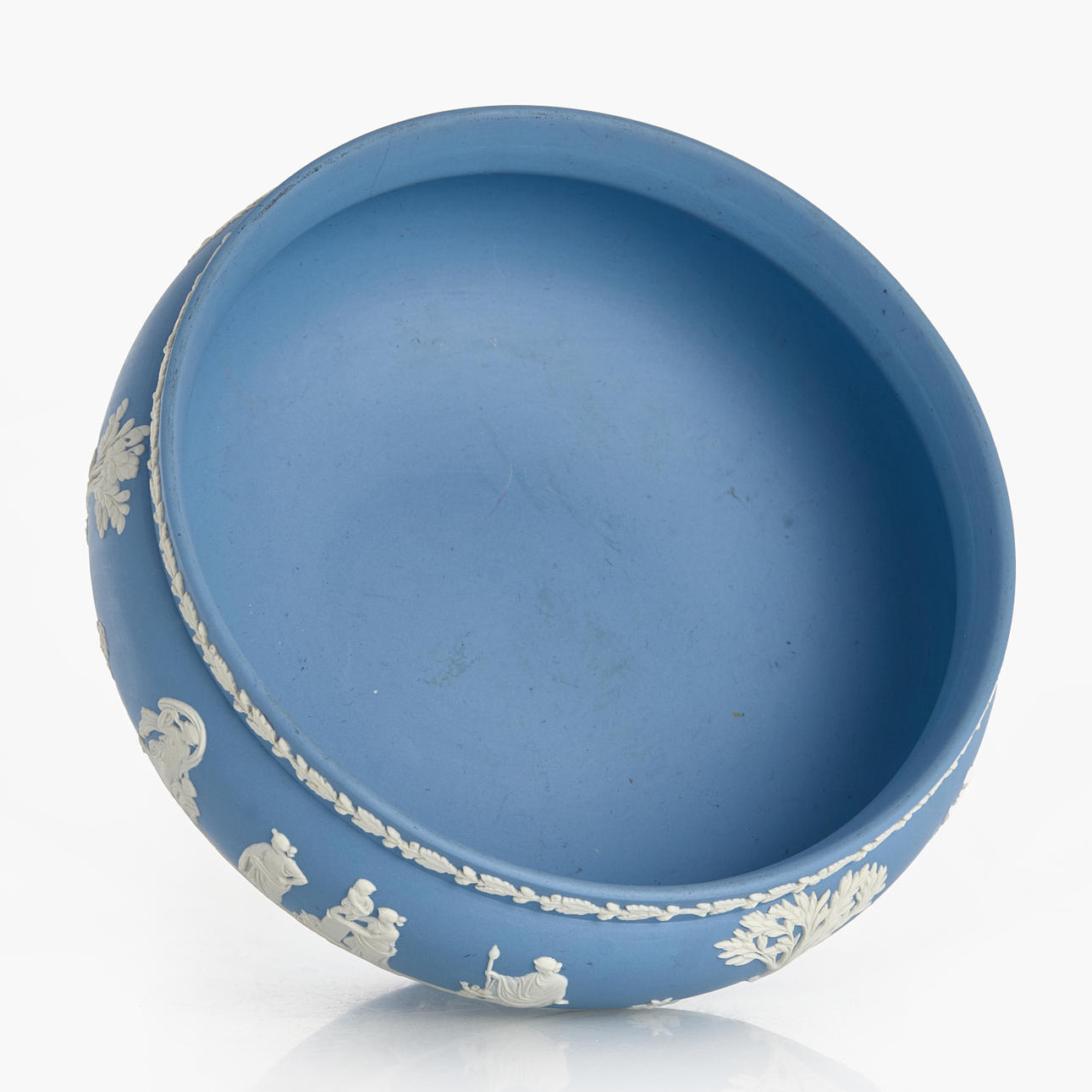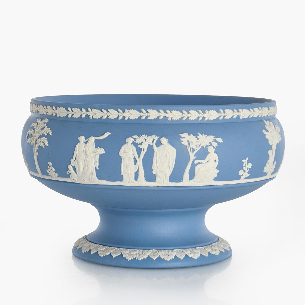 Decoración en relieve blanco de escenas antiguas y borde de palmeta sobre fondo azul.