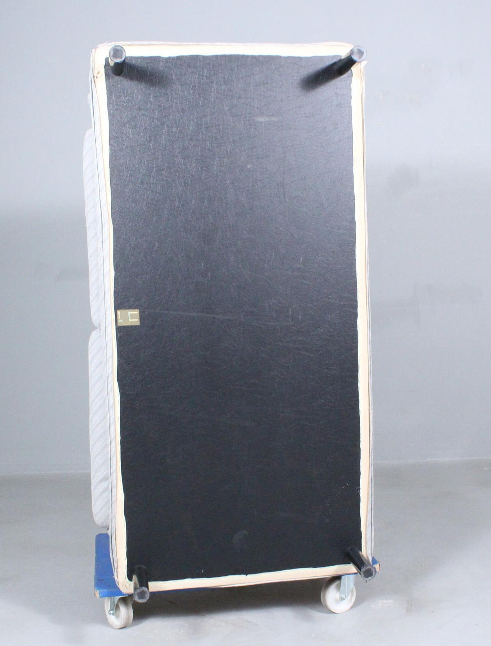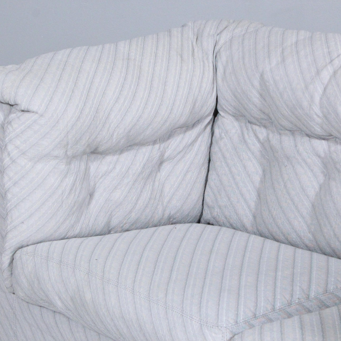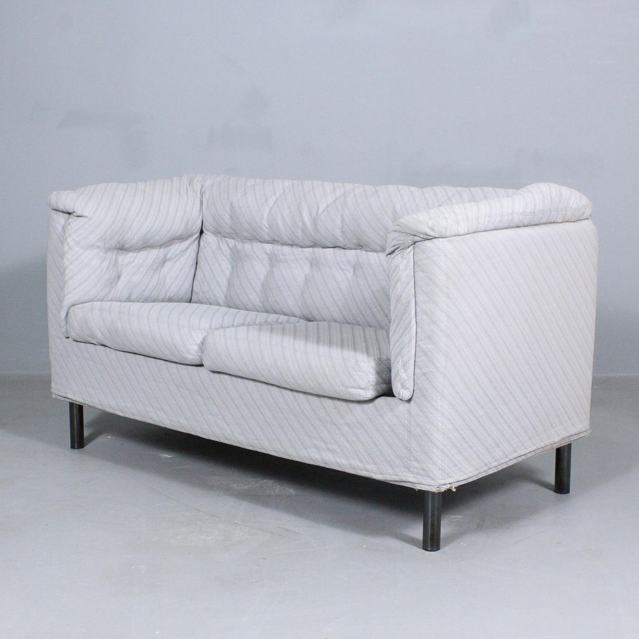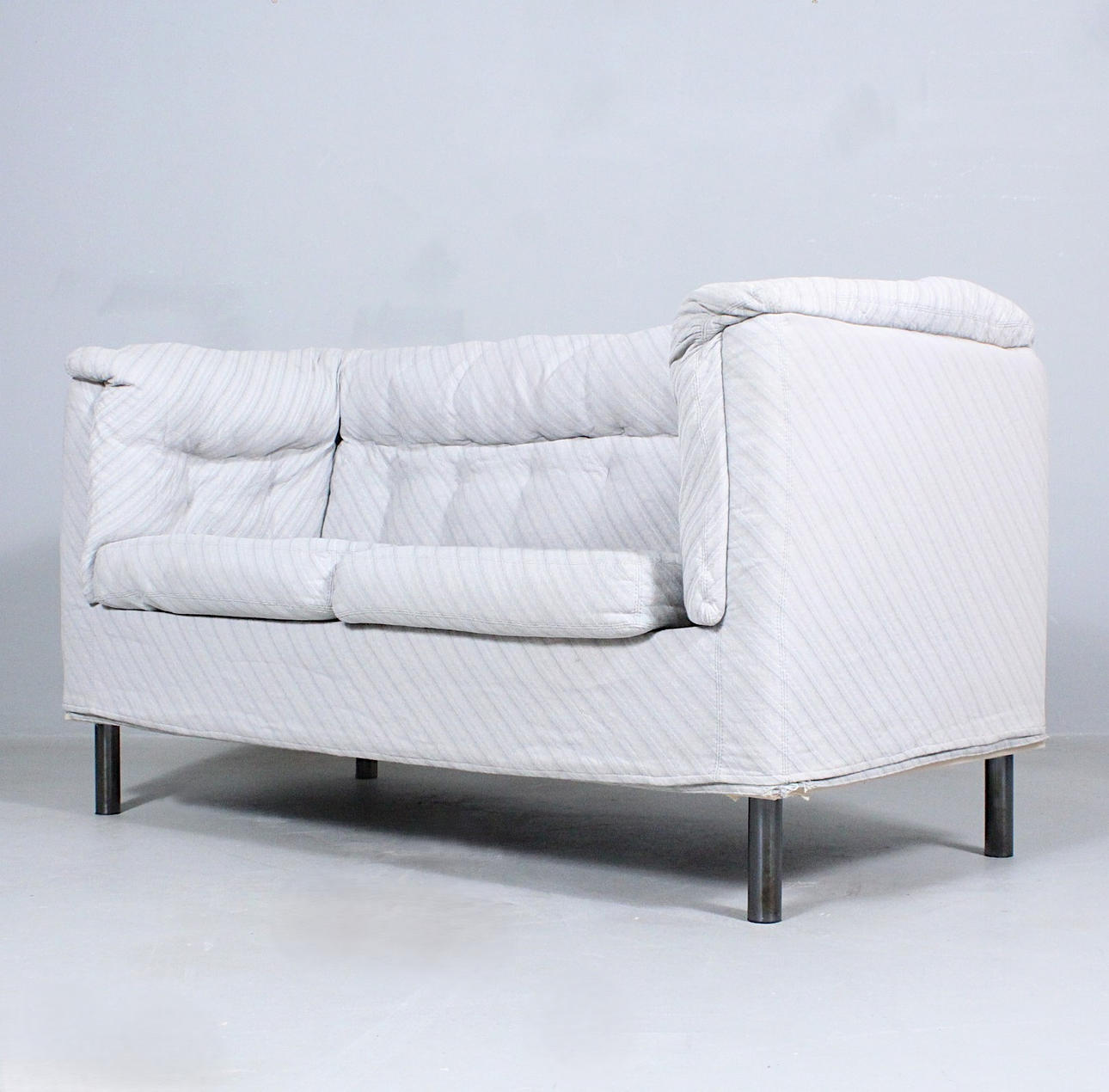 Zanotta, sofá/biplaza, Italia, construcción tapizada con tela brillante a rayas, con etiqueta del fabricante en la parte inferior,
